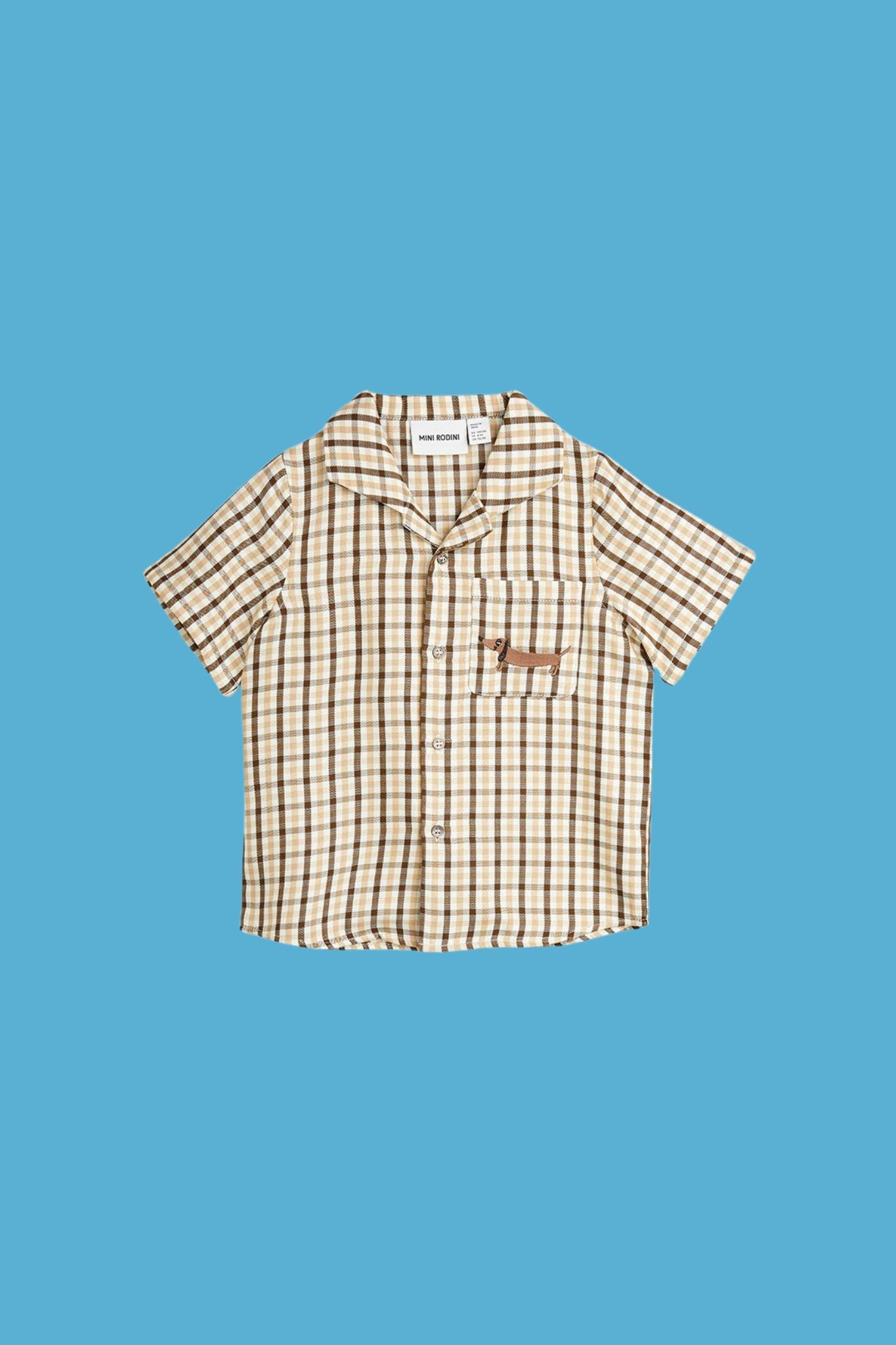 This adorable, short sleeved shirt from Mini Rodini features a gingham print, buttons down the front, and a sausage dog embroidered onto the chest pocket. Add a pair of jeans for an everyday outfit.