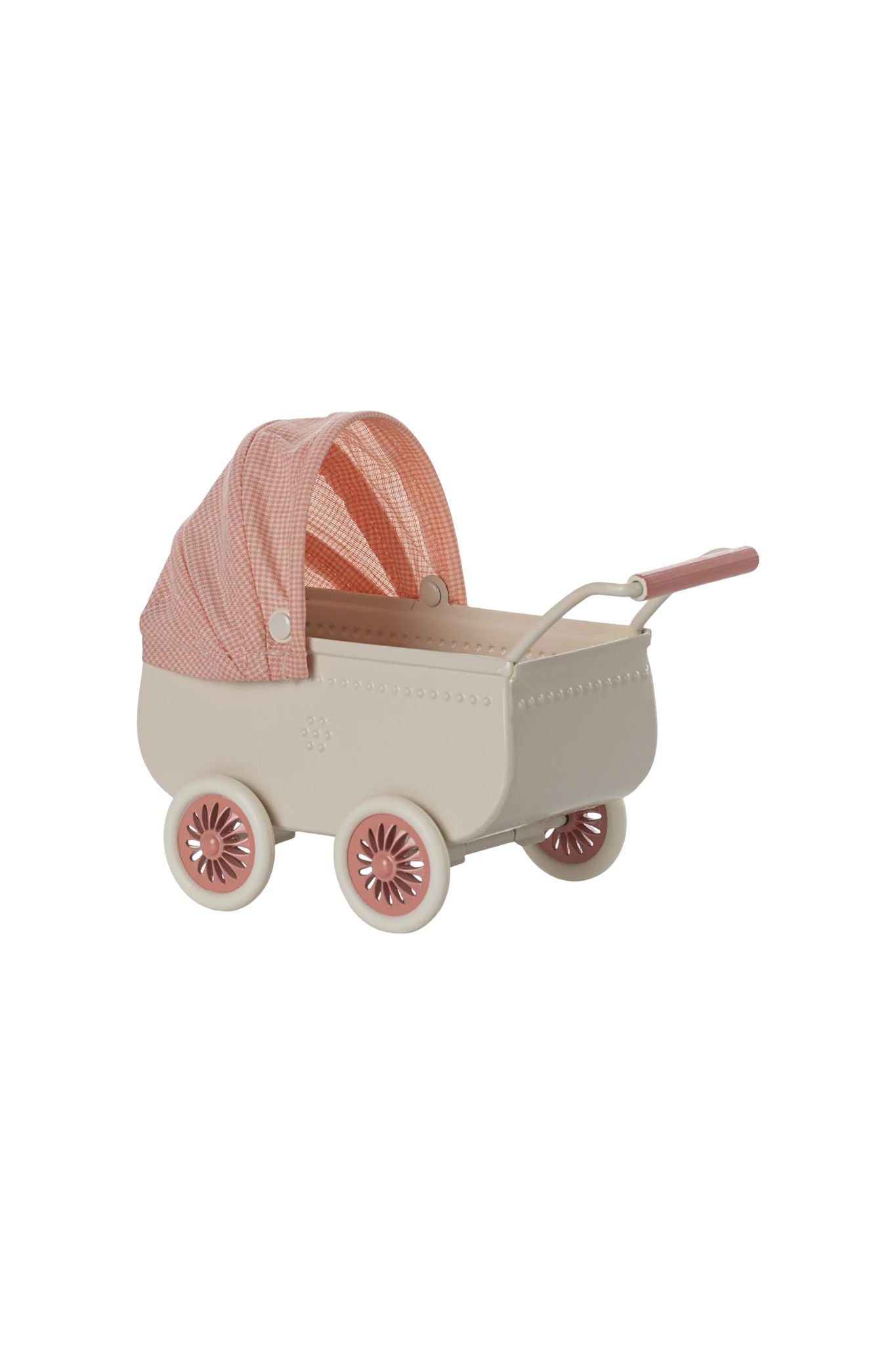The Maileg Coral Mouse Pram is a charming miniature accessory designed for Maileg's baby mice. Featuring a vintage-inspired design, this pram is crafted from metal with embossed details and includes a soft cotton sleeping bag and mattress, providing a cozy resting place for your baby mouse during outings.
