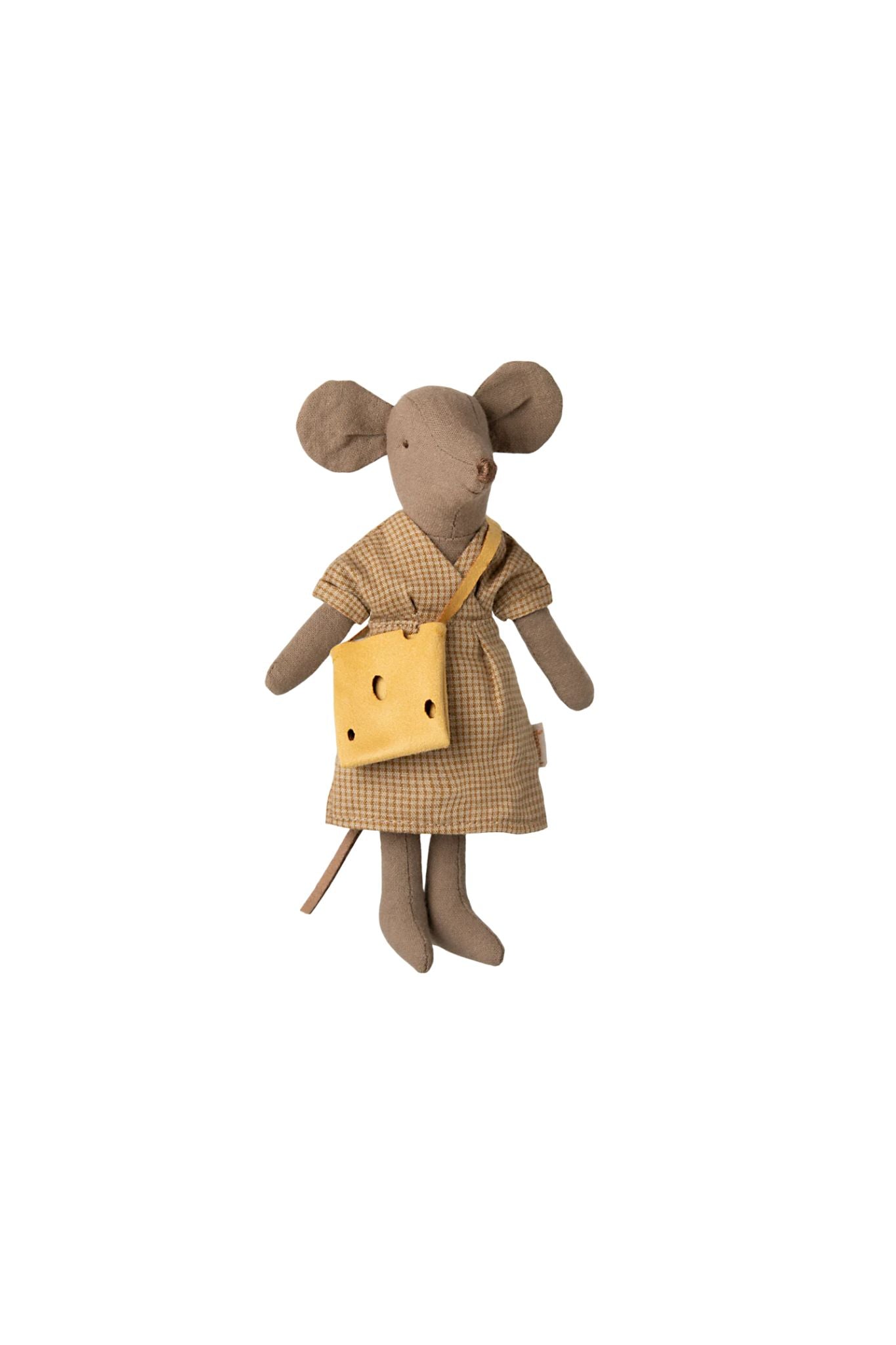 Maileg's Light Brown Mum Mouse is a delightful addition to any miniature collection. Standing at approximately 5.91 inches tall, she is dressed in a beige checked wrap dress and carries a crossbody purse adorned with charming cheese-hole details. Her body is made of soft cotton, and she is filled with recycled polyester and PE pellets, ensuring a cuddly feel.