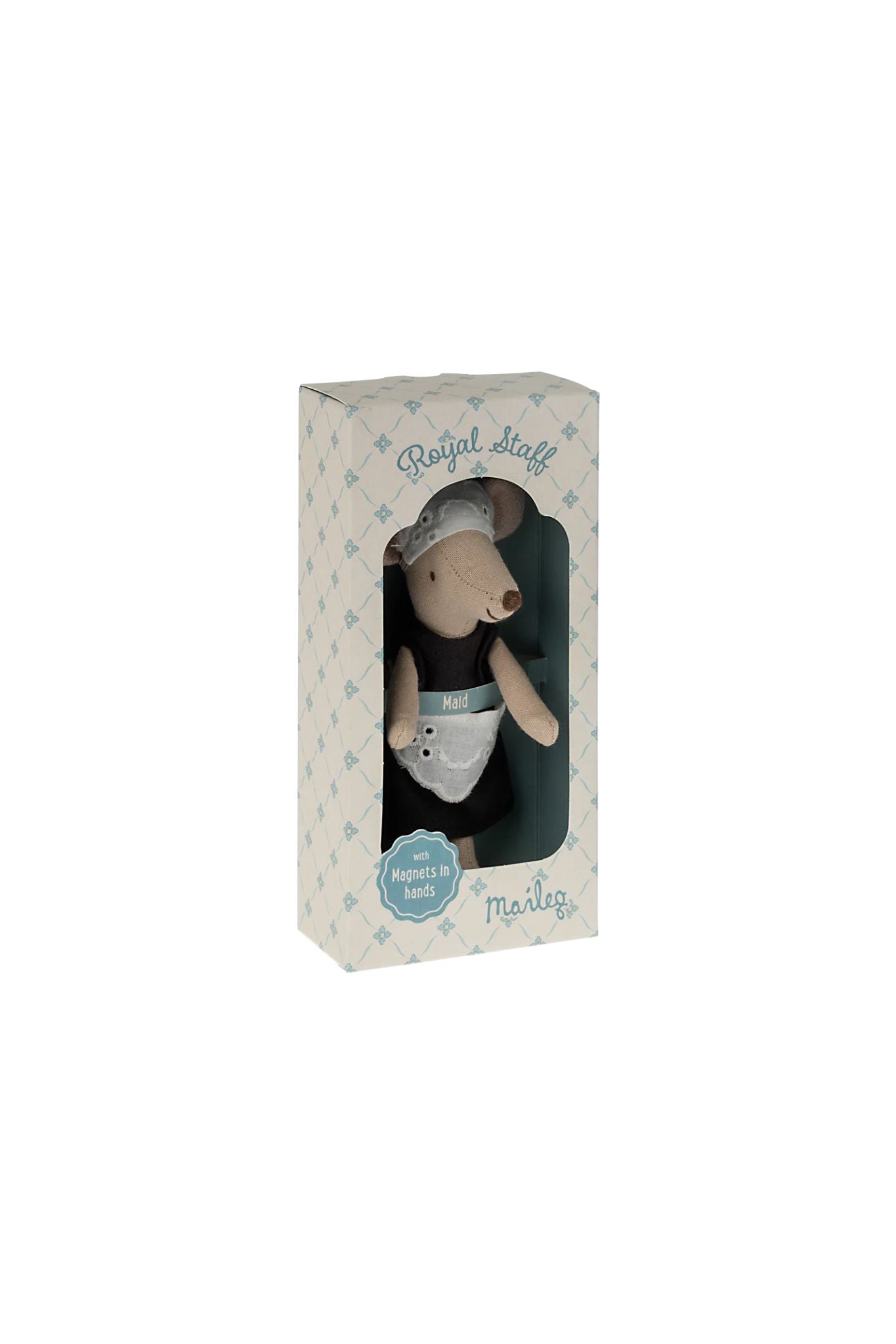 Maileg's Maid Mouse is ready to help with every dollhouse chore! Dressed in a classic maid uniform, her magnetized hands easily hold metal cleaning tools, adding charm and fun to playtime.