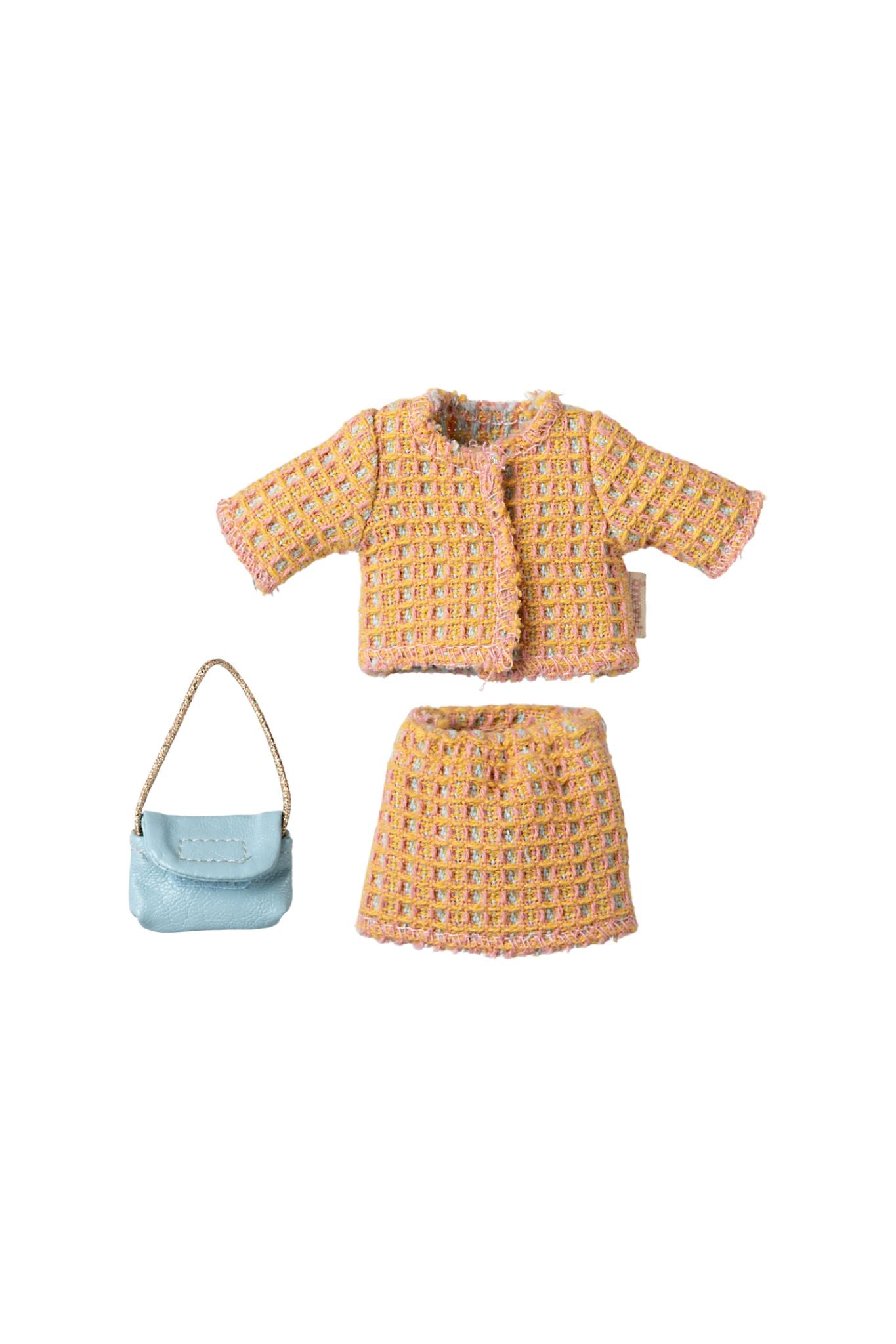 The Maileg Mum Mouse Suit is a charming outfit designed for Maileg's Mum Mouse, combining elegance and playful details. This set features a short woven jacket and skirt made from cotton, viscose, and polyurethane materials. Additionally, it includes a fun blue purse to complete the ensemble. The suit is suitable for mice approximately 5 inches tall.