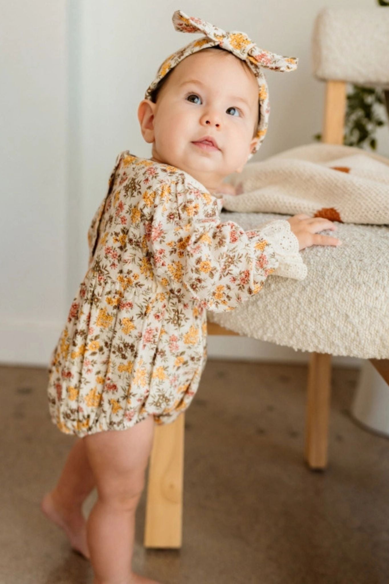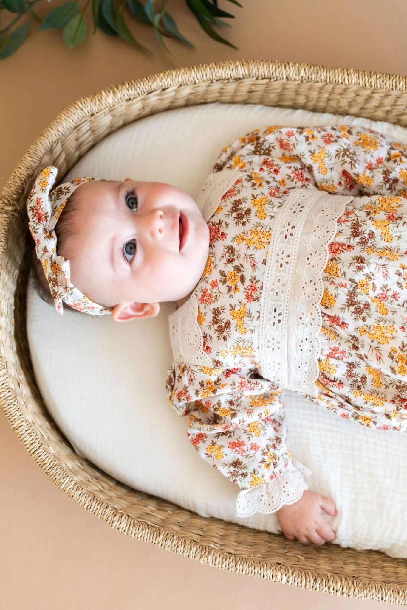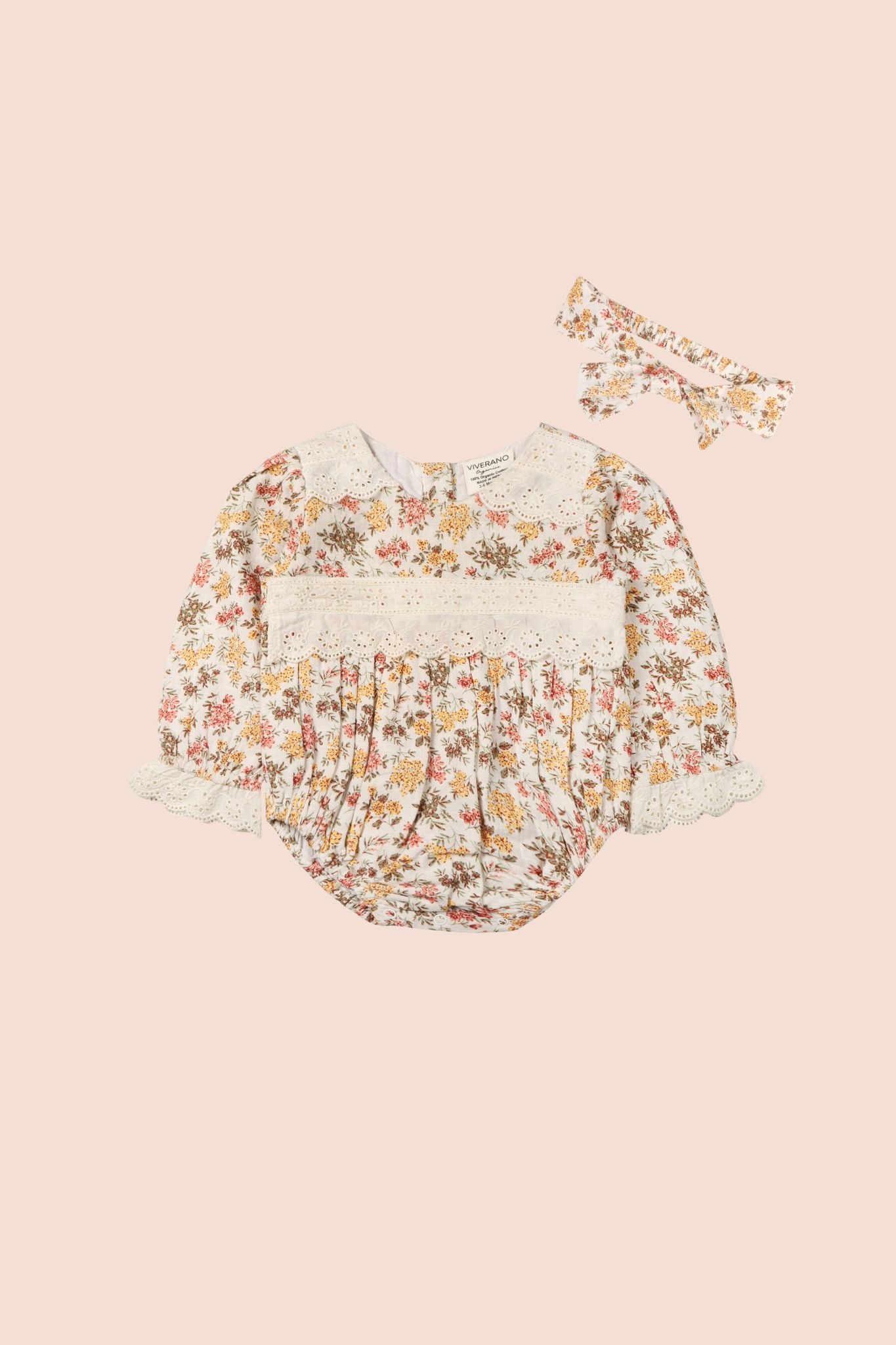 Wrap her in organic love with this baby girl bubble romper and headband set by Viverano. Featuring a warm-toned floral pattern, the romper is adorned with a delicate lace collar and charming lace details across the bodice and sleeve openings, while the matching headband adds the perfect finishing touch. Cozy and playful, it’s ideal for naps, playtime, or special moments.