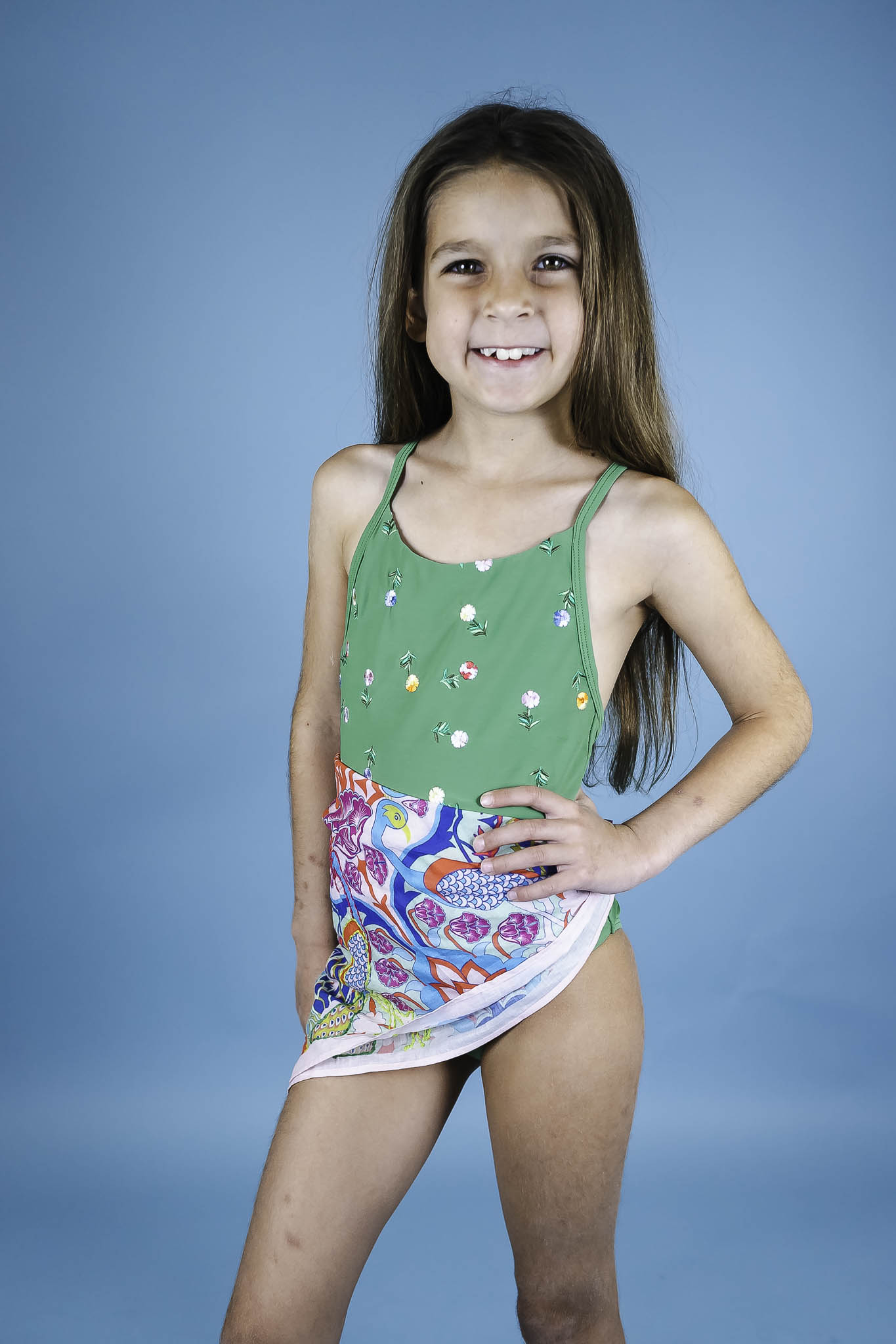 Brighten up your girl's day with this pretty, one-piece swimsuit from Molo! It comes in a Kelly-green hue and features dainty embroidered flowers throughout. A cross-back neckline makes for a unique silhouette.