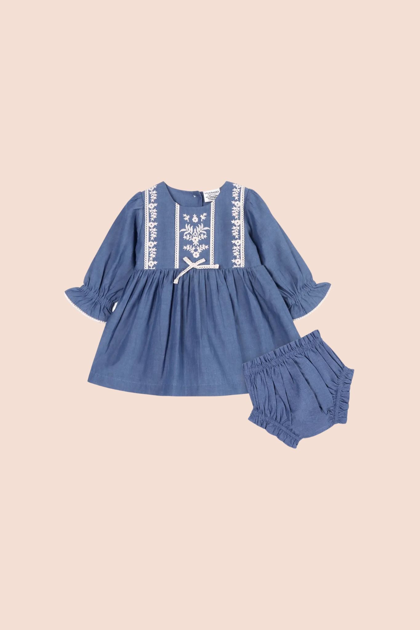 Dress her in sweet charm with this baby girl dress and bloomer set by Viverano. Featuring delicate floral embroidery on the front, the soft chambray fabric is cozy, breathable, and perfect for playdates, nap time, or special occasions.