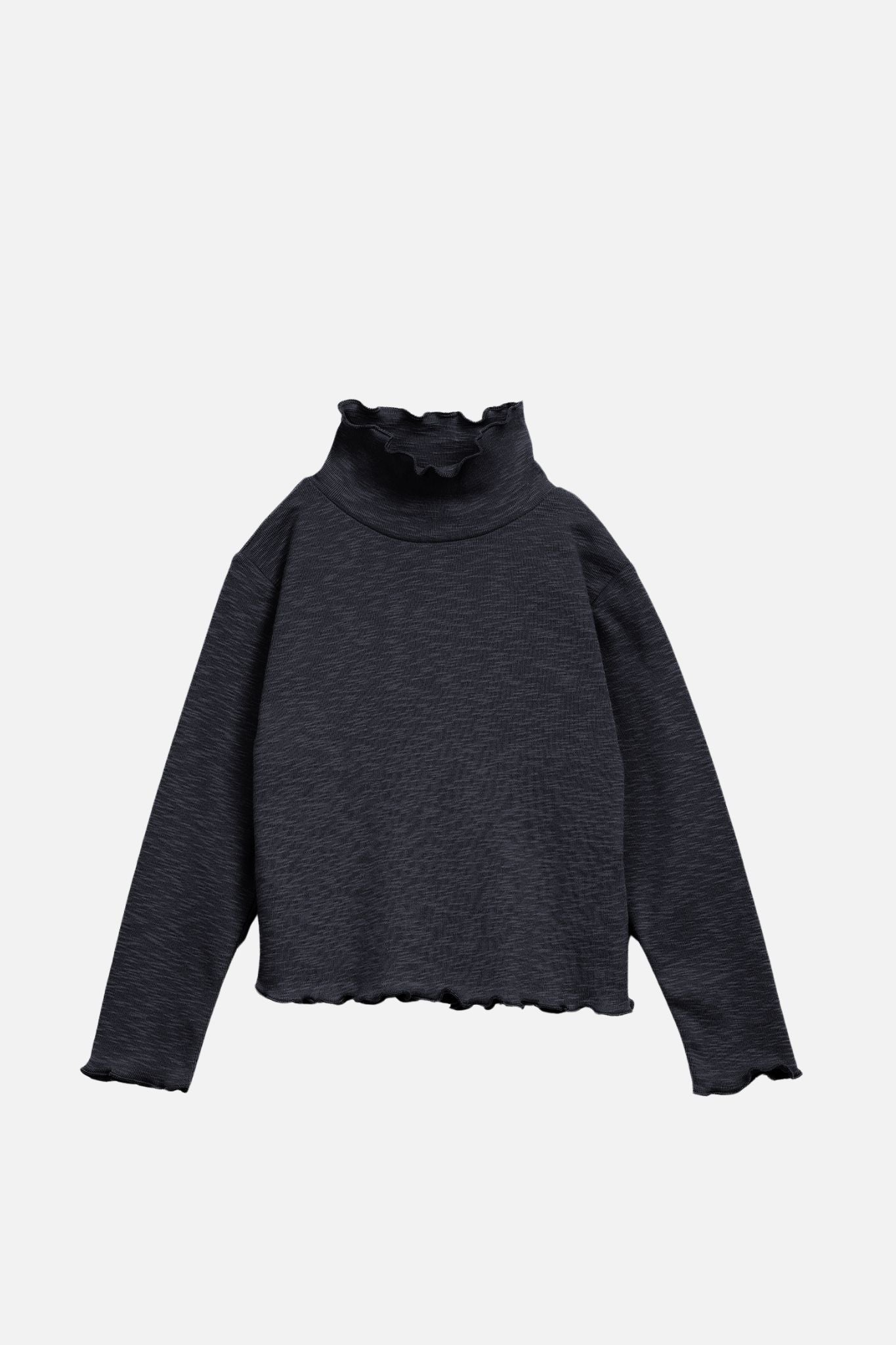 This navy, long-sleeved Play Up shirt is deal for layering! It features a mock neckline, long sleeves, and a lettuce edge hem.