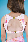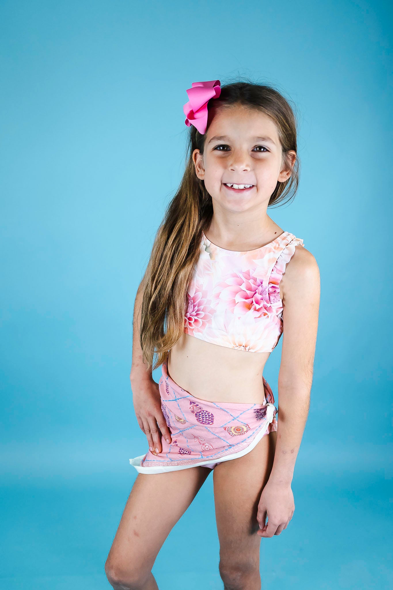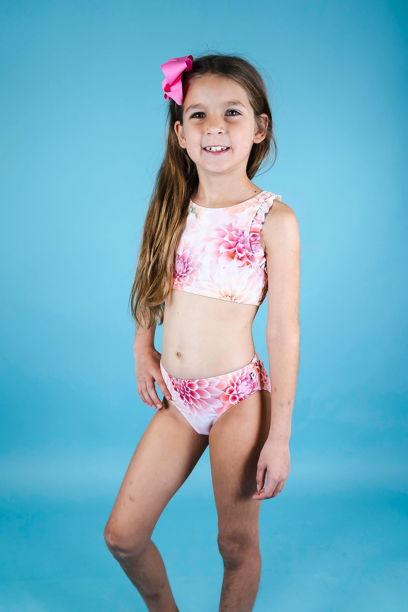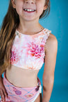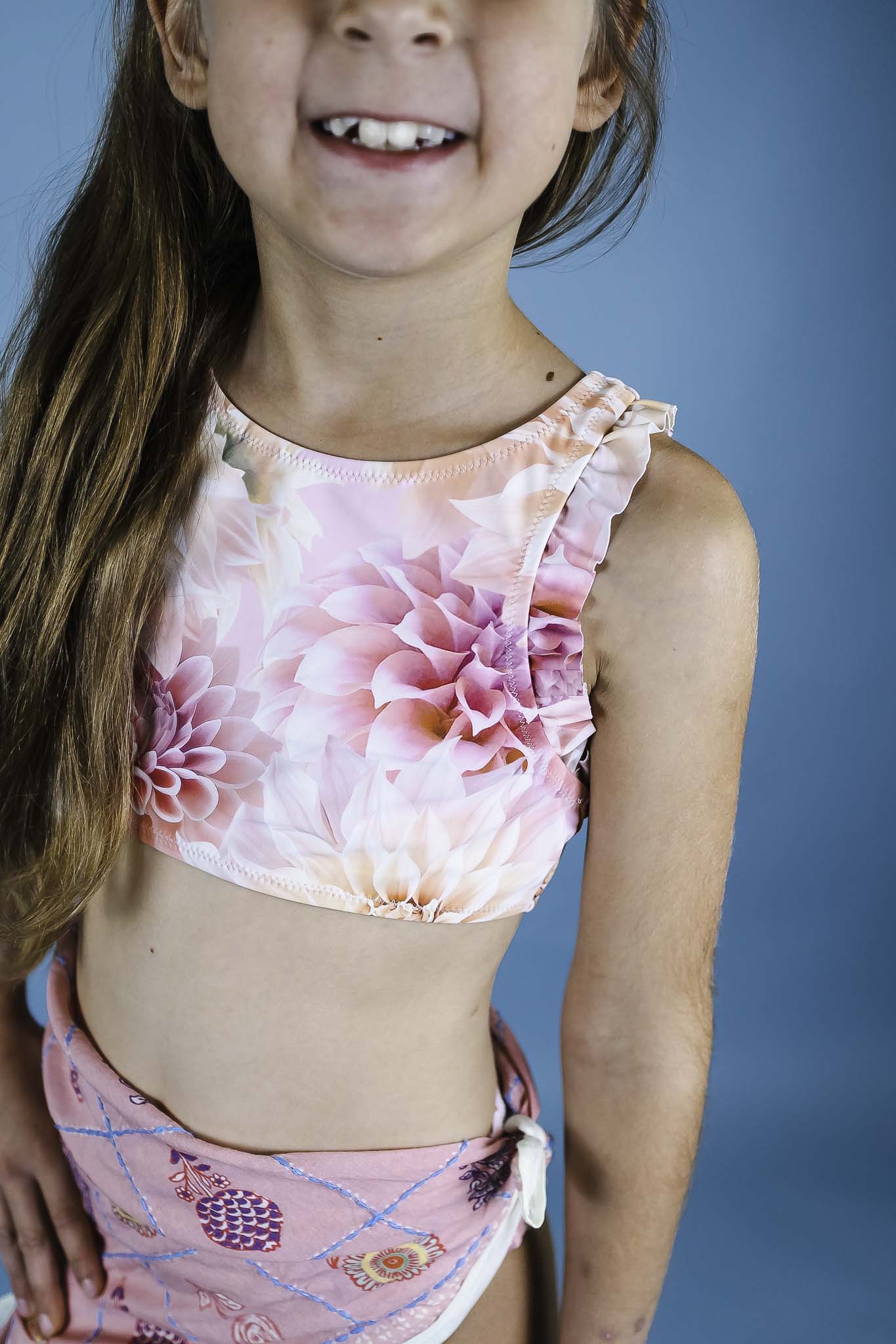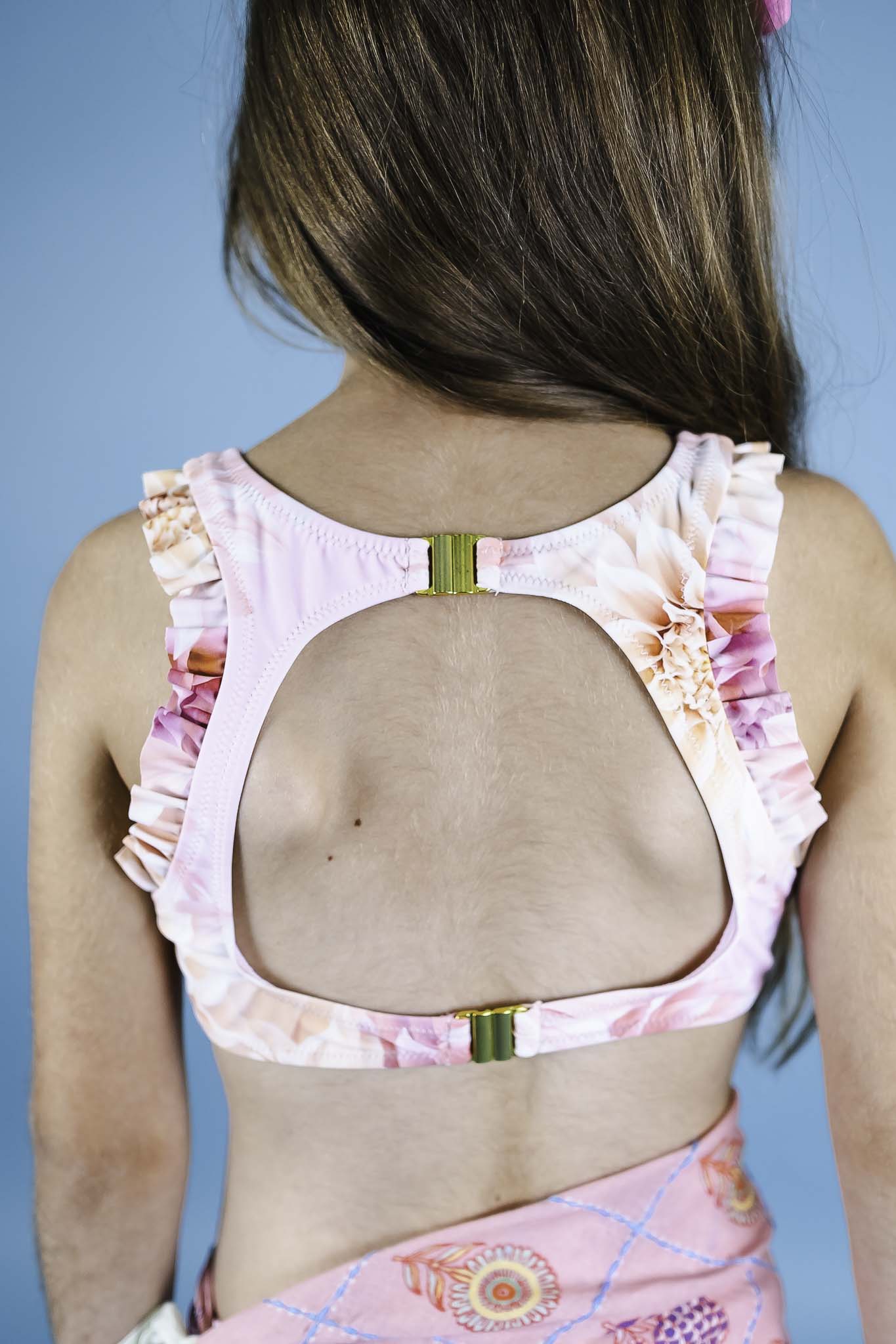 This beautiful, photorealistic bikini from Molo includes a high-neck top with an open back and matching hipster bottoms. A pink flower print adorns each piece.