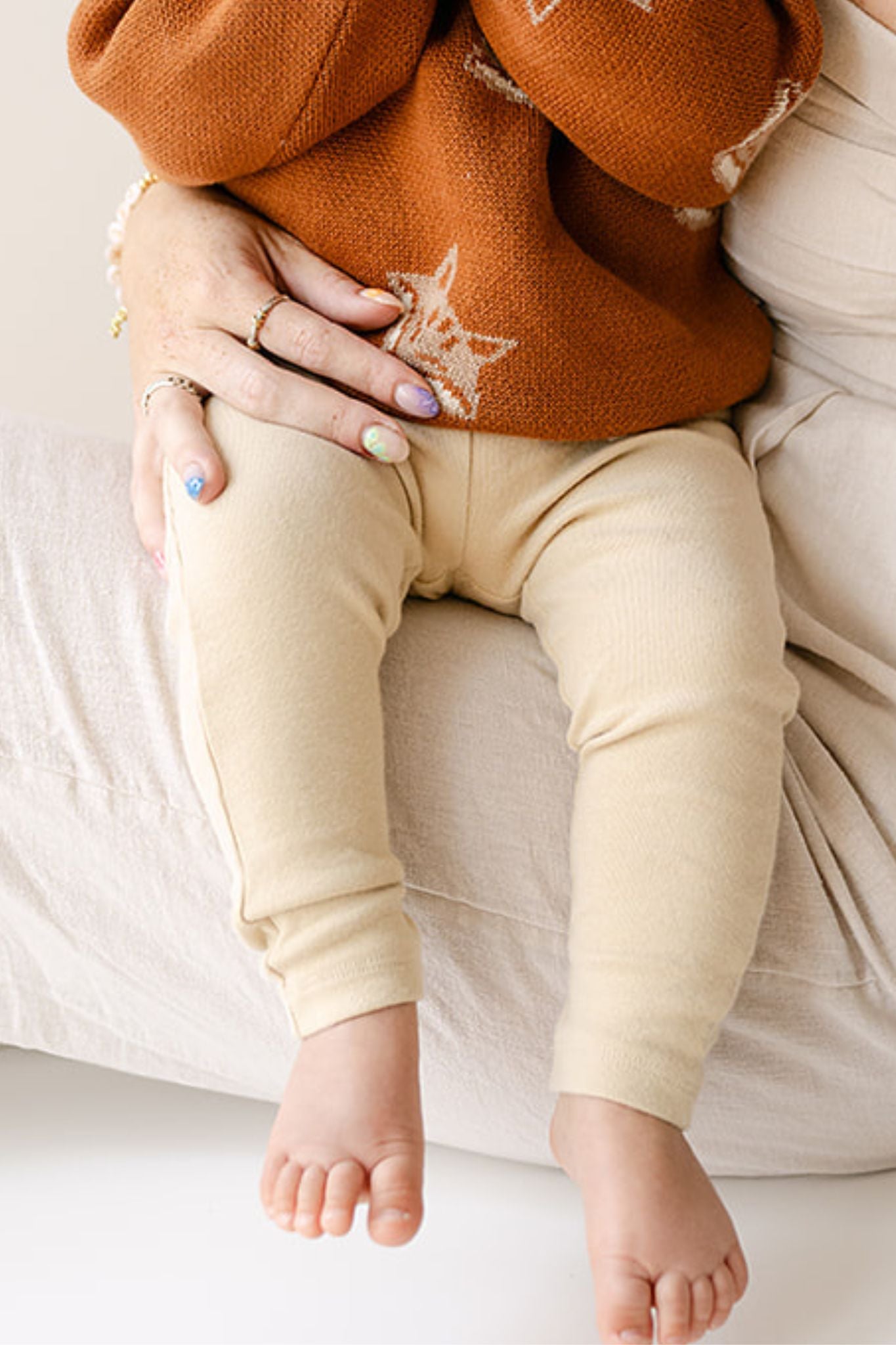 These oatmeal-colored joggers by Dear Hayden are a must-have layering piece for baby. They come in a knit fabric and feature a stretchy waistband.