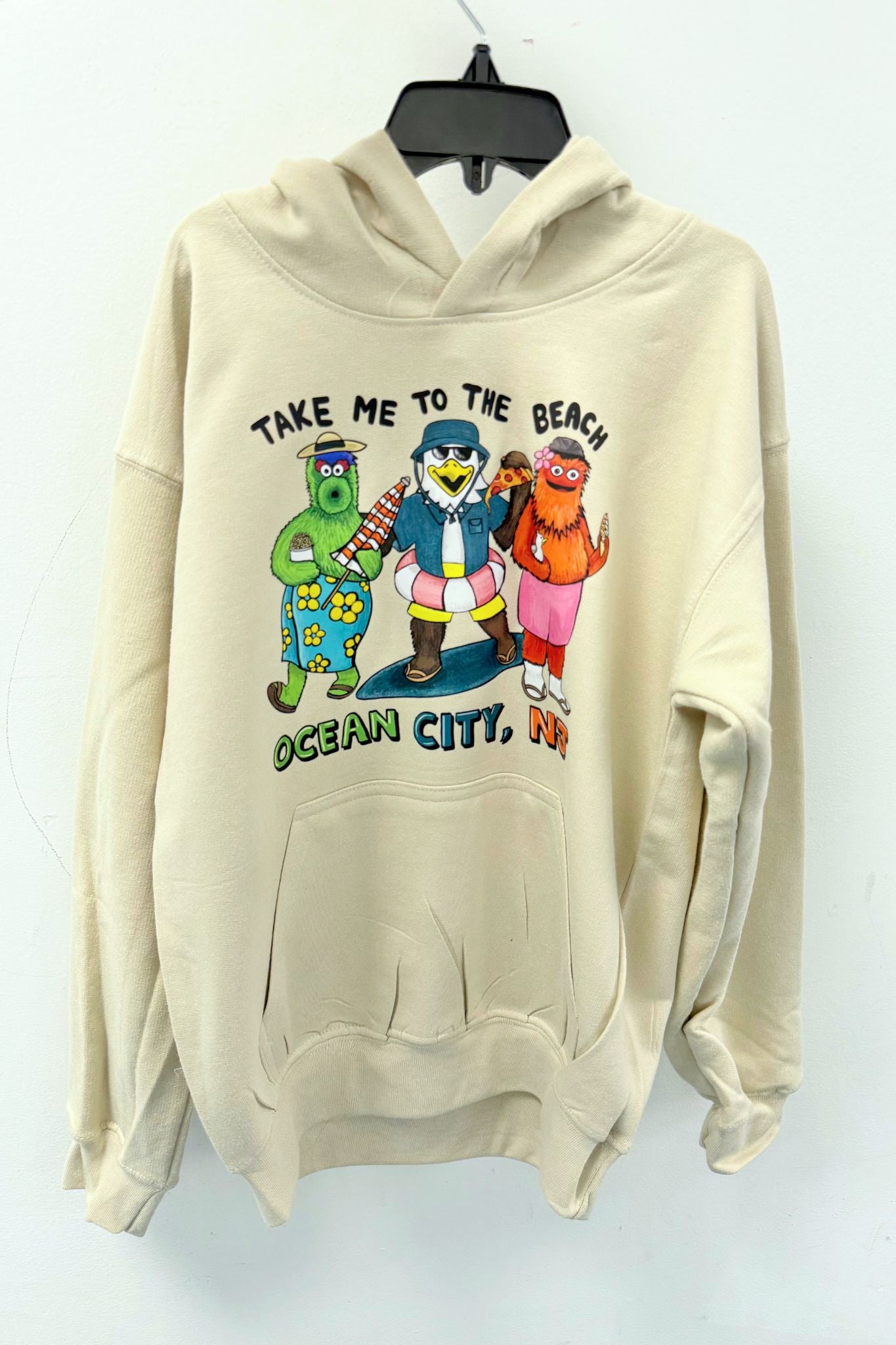 Our newest original design! It features the Philadelphia Phillies, Eagles, and Flyers mascots dressed up and ready for the beach in Ocean City, New Jersey!