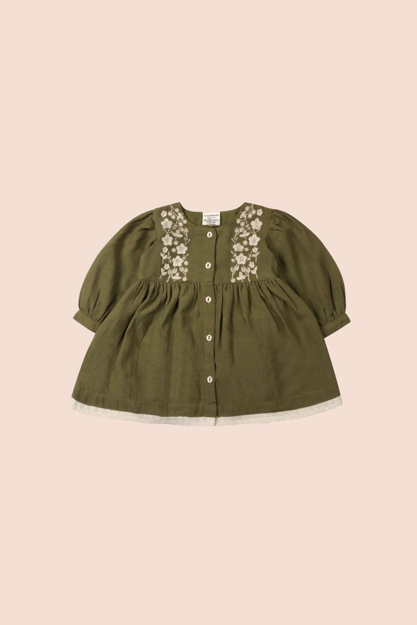 Delicate and dreamy, this baby girl dress and bloomer set by Viverano is crafted from a super soft linen blend for all day comfort. Sweet floral embroidered details on the front and lace trim along the hem add a touch of vintage charm, while the matching bloomers make it an easy, put together outfit.