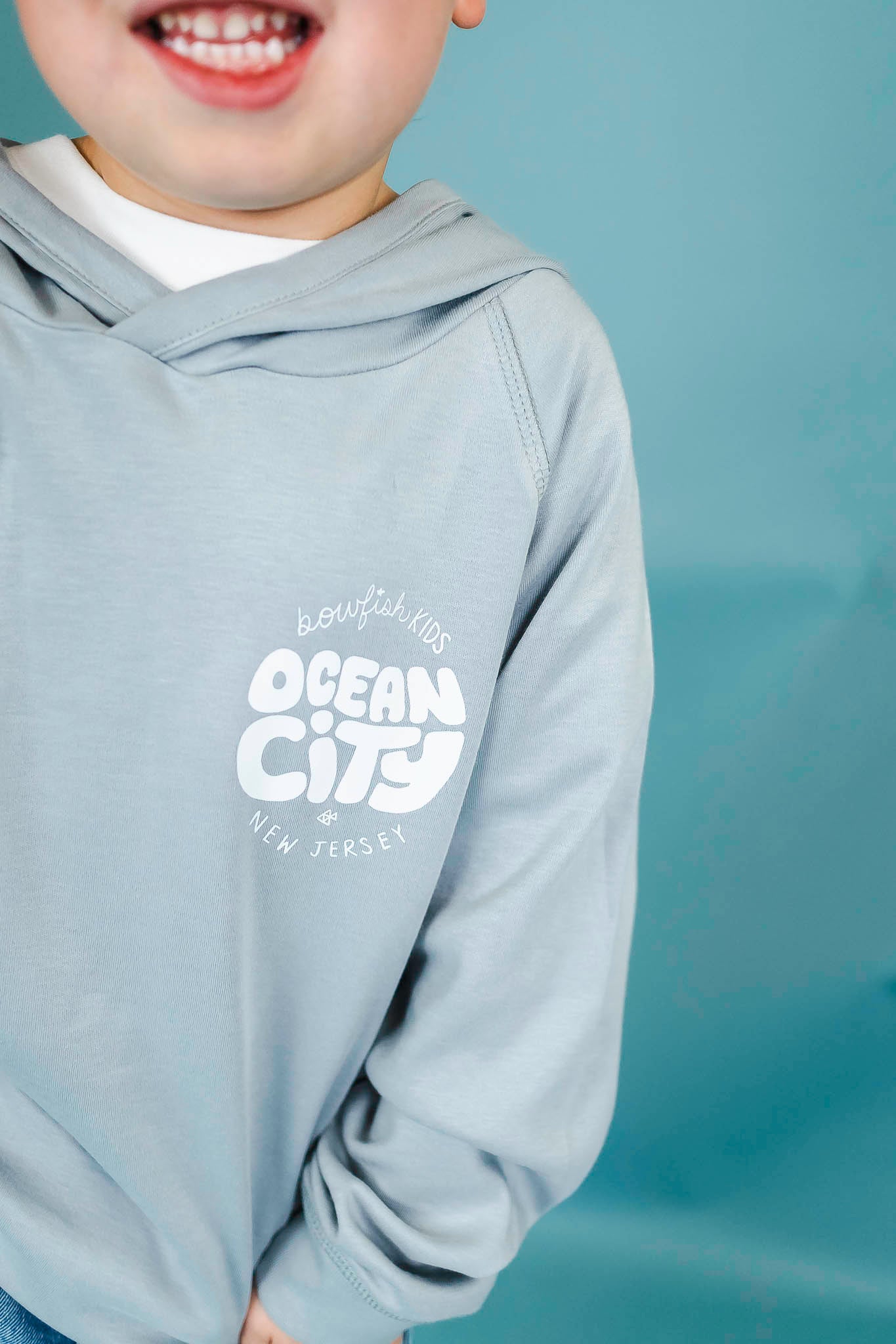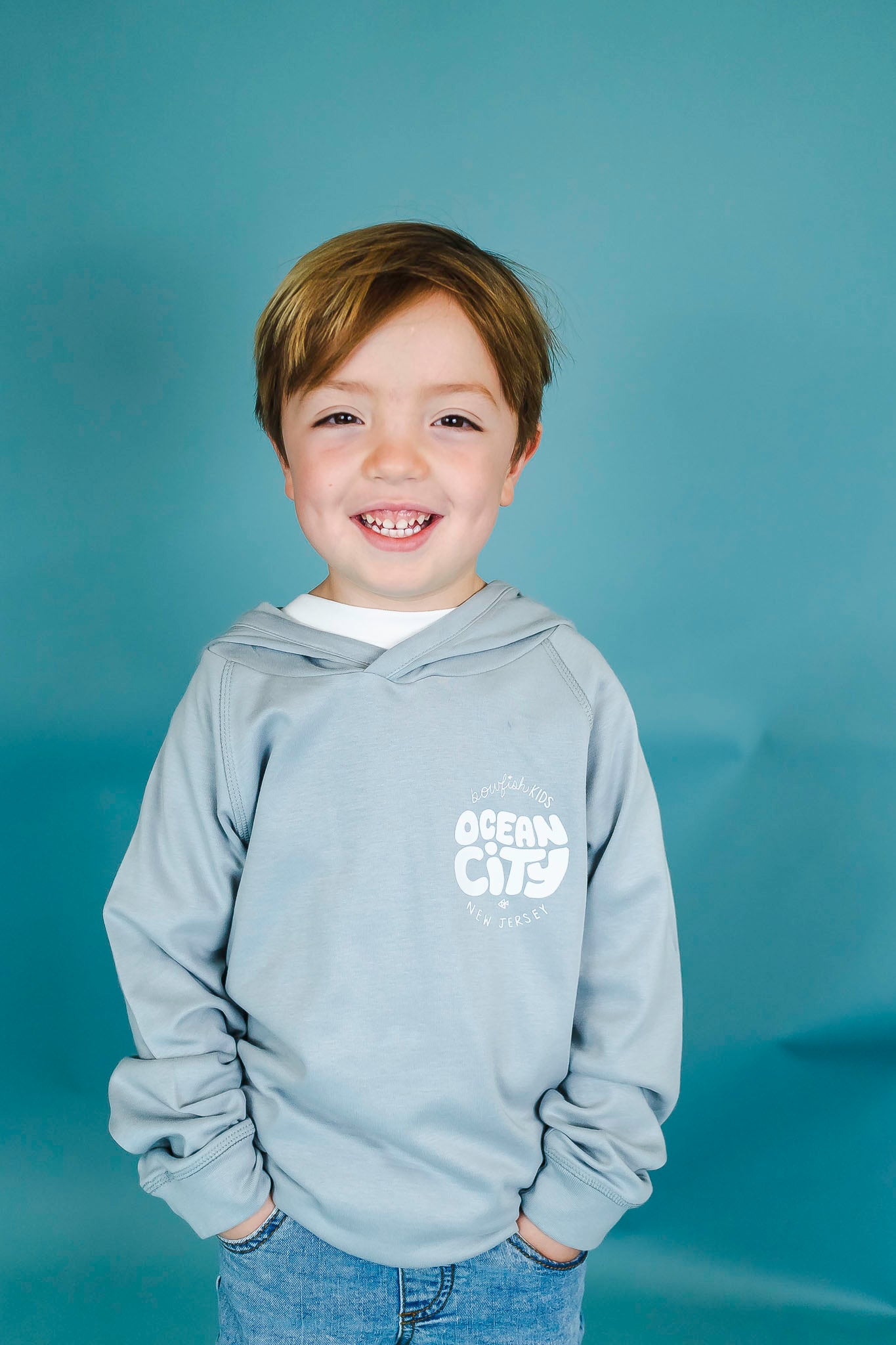 This Organic Mist OCNJ Hooded Pullover features our Ocean City, New Jersey, circle pocket design! It is made of the softest organic cotton from Colored Organics and features a hood for your toddler!