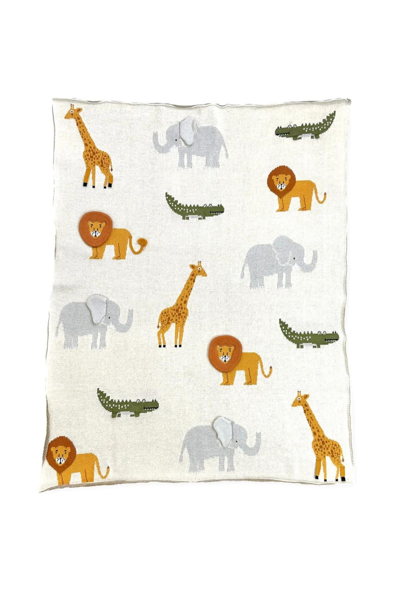 This beautiful blanket from Viverano comes to life with 3D accents on various animals! It is made from an organic fabric and features elephants, lions, and more knitted throughout.