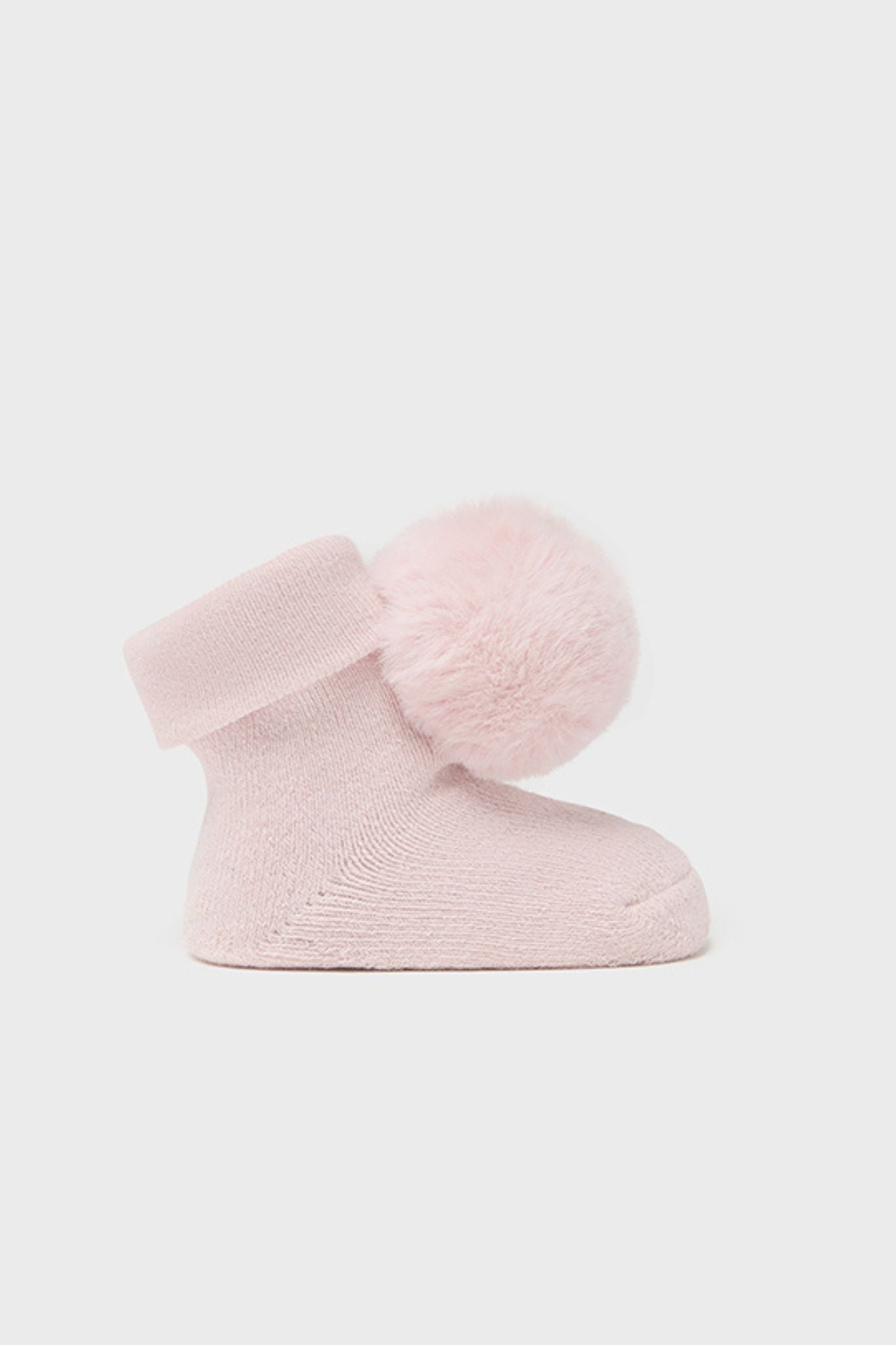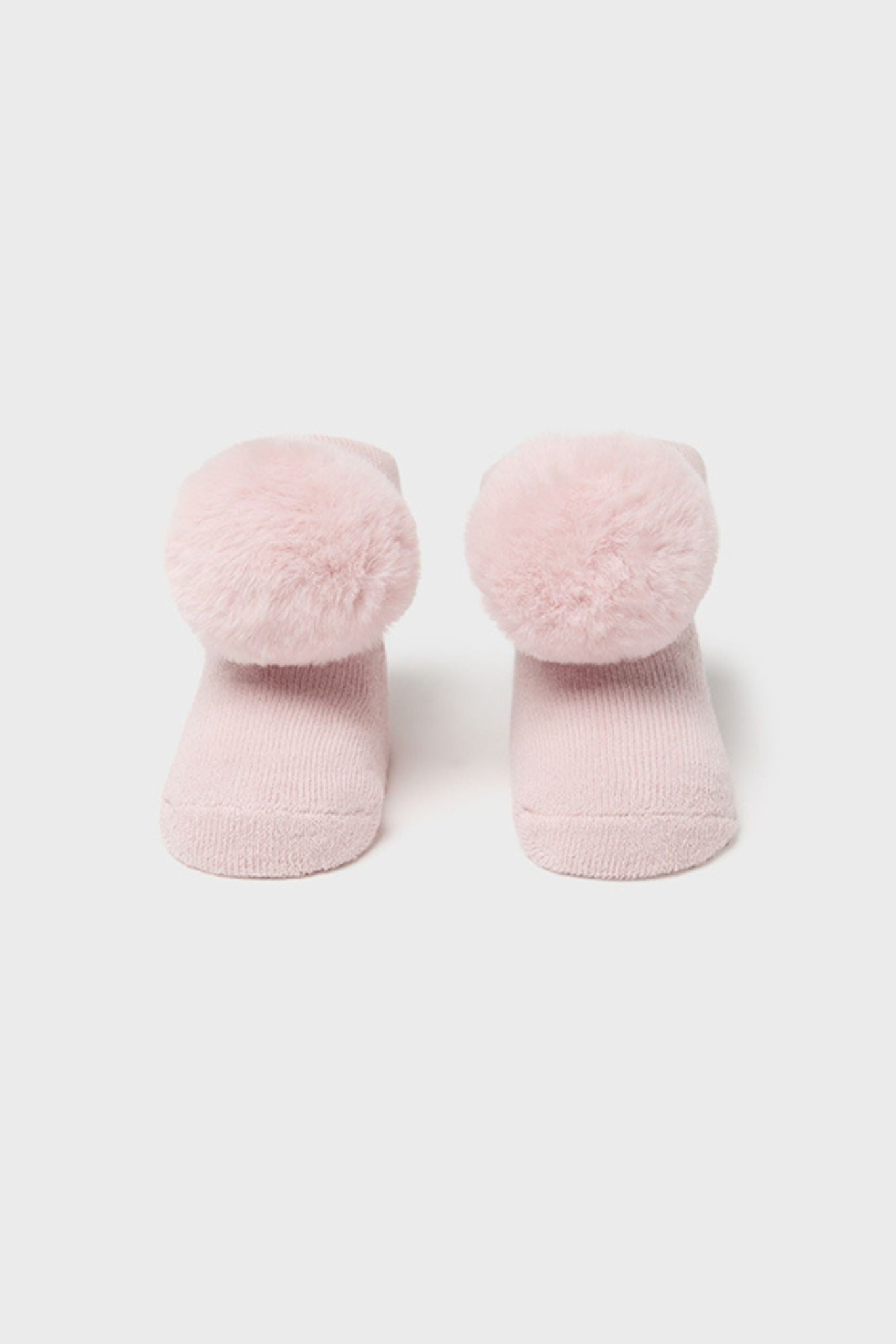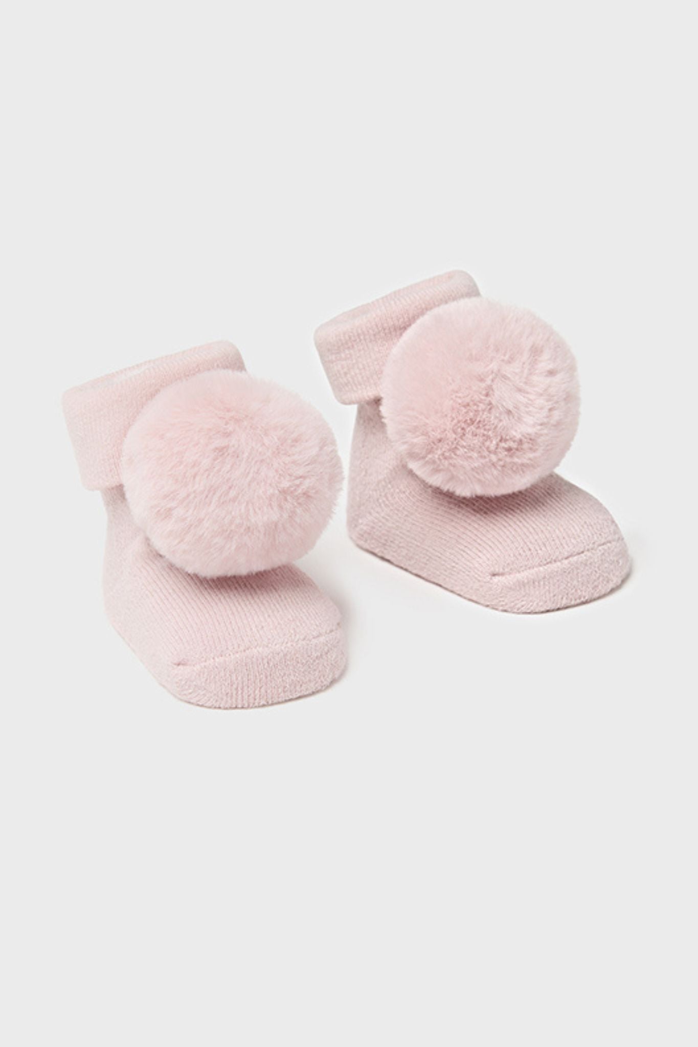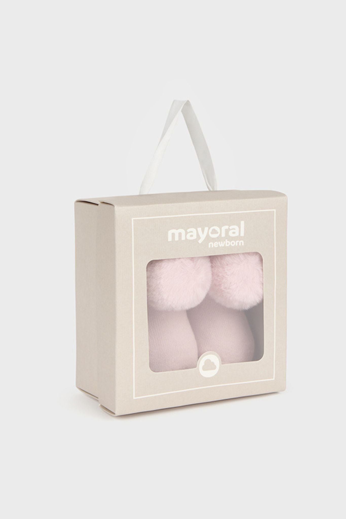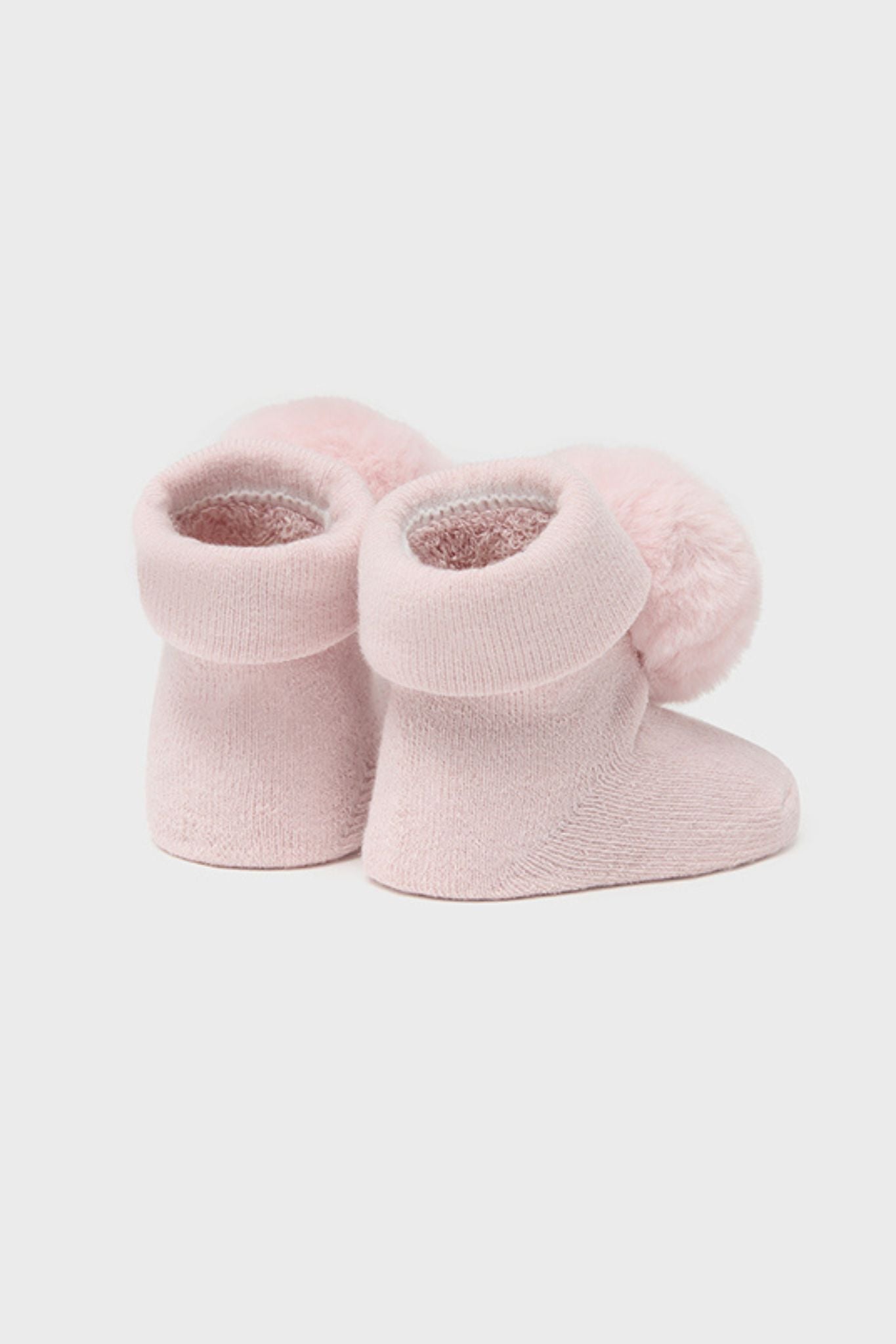 Outfit baby girl in these winter-ready accessories from Mayoral Newborn! This soft pink set includes a pair of pom pom booties and a matching headband.
