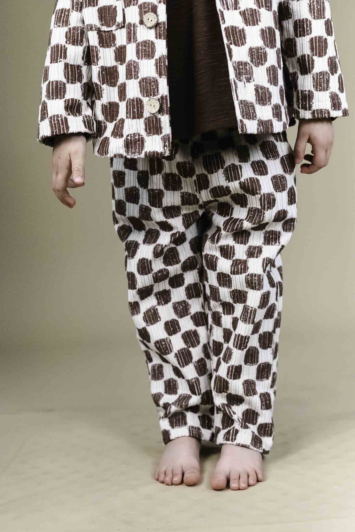 Make his outfit pop with these checkered corduroy trousers by Play Up. The brown and off-white fabric, crafted from cotton and recycled fibers, comes alive with the bold tile pattern, giving these pants a standout edge that’s hard to miss.