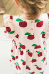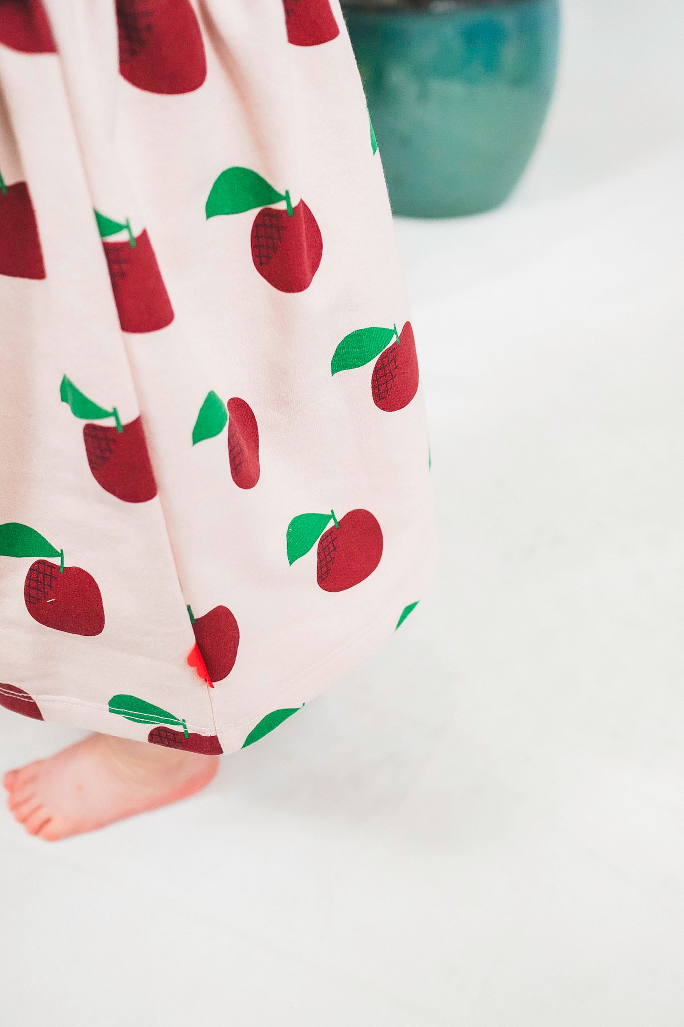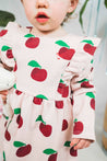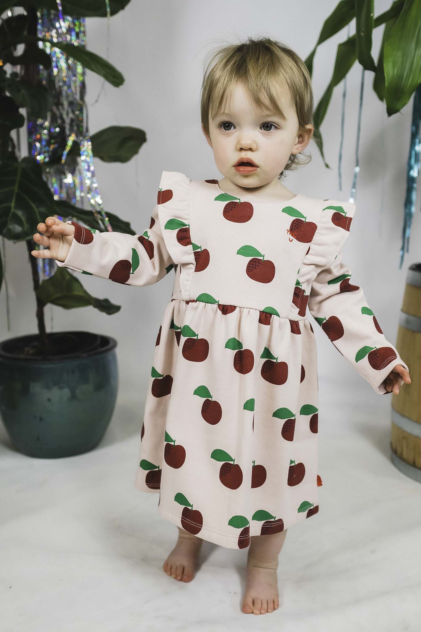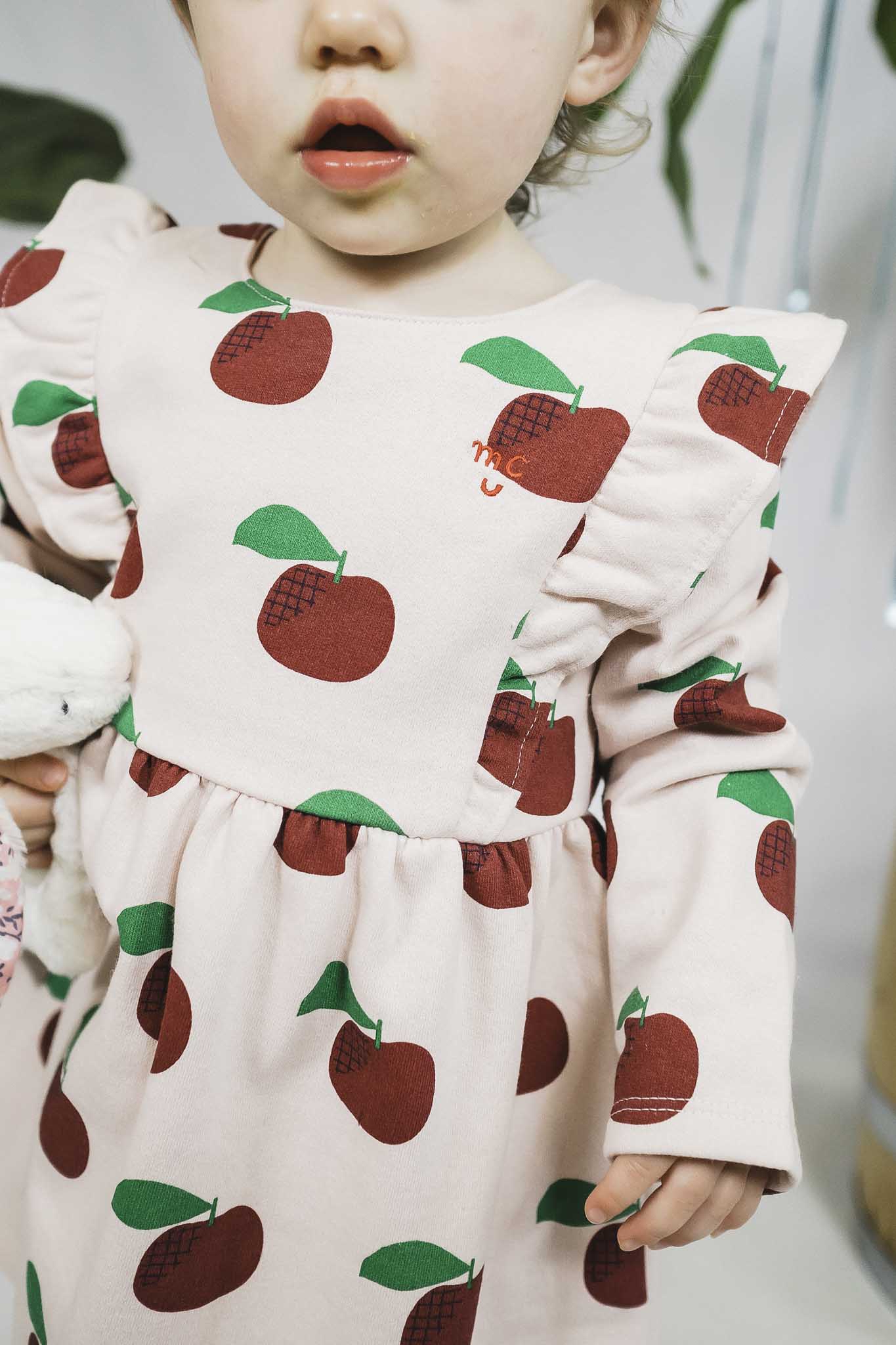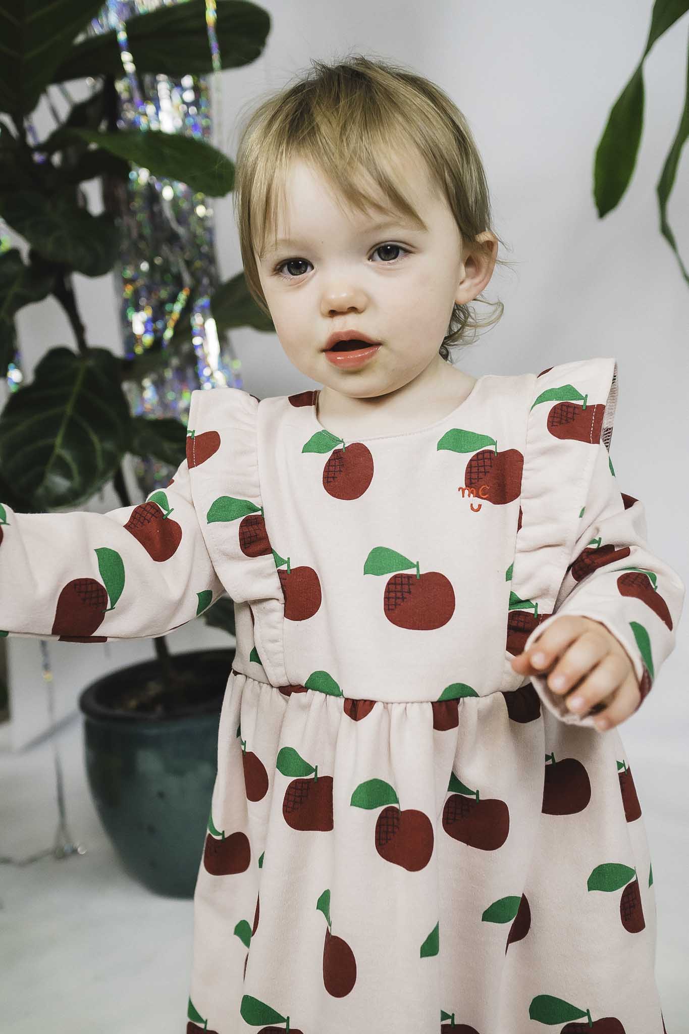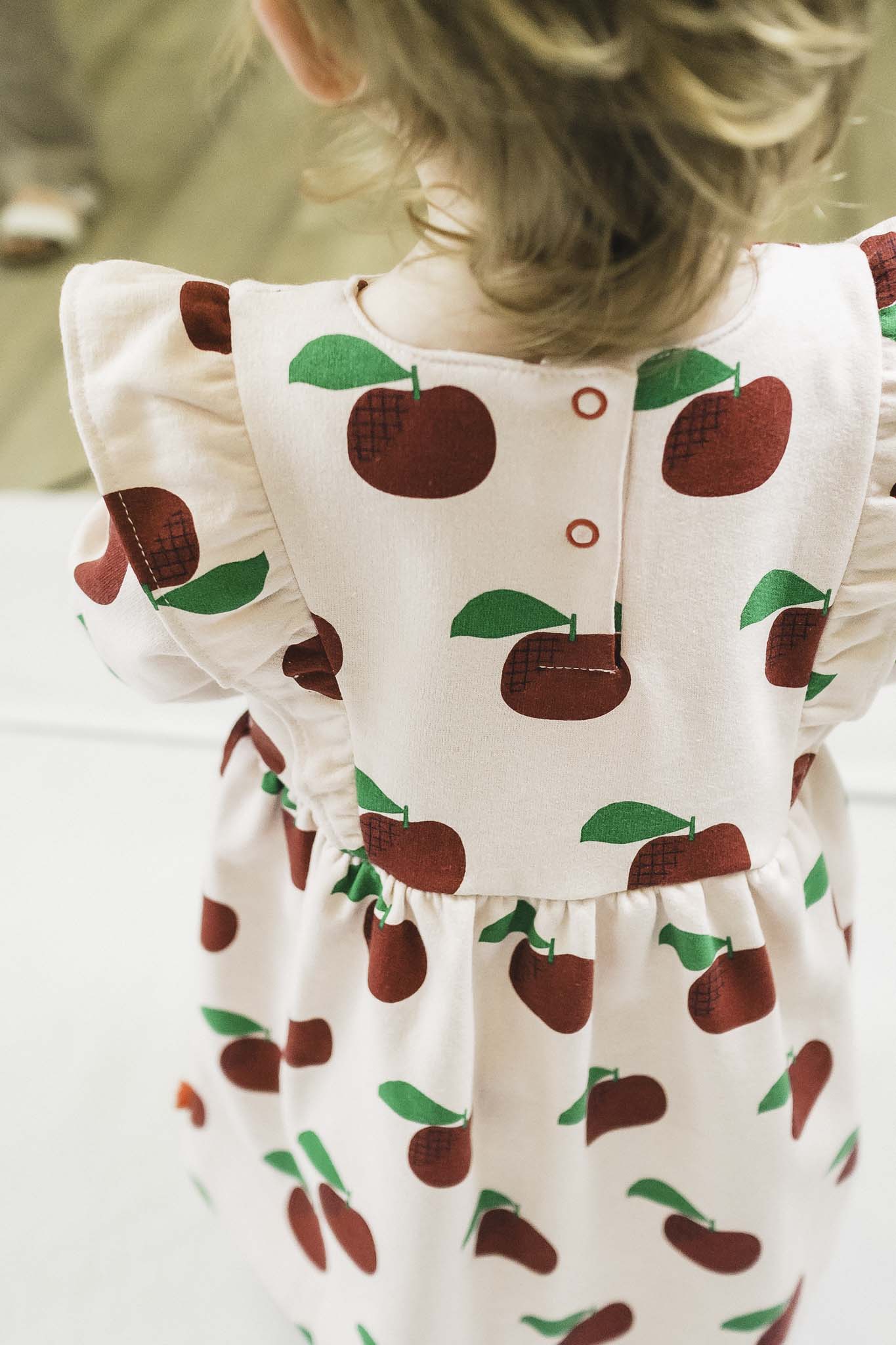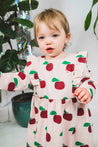 This beautiful Mon Coeur dress is made from recycled cotton. It features long sleeves, an allover apple print, and ruffles along the shoulders. Add a pair of flats for the sweetest outfit!