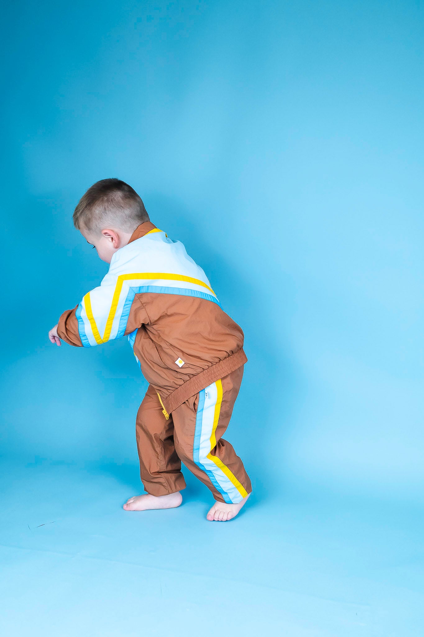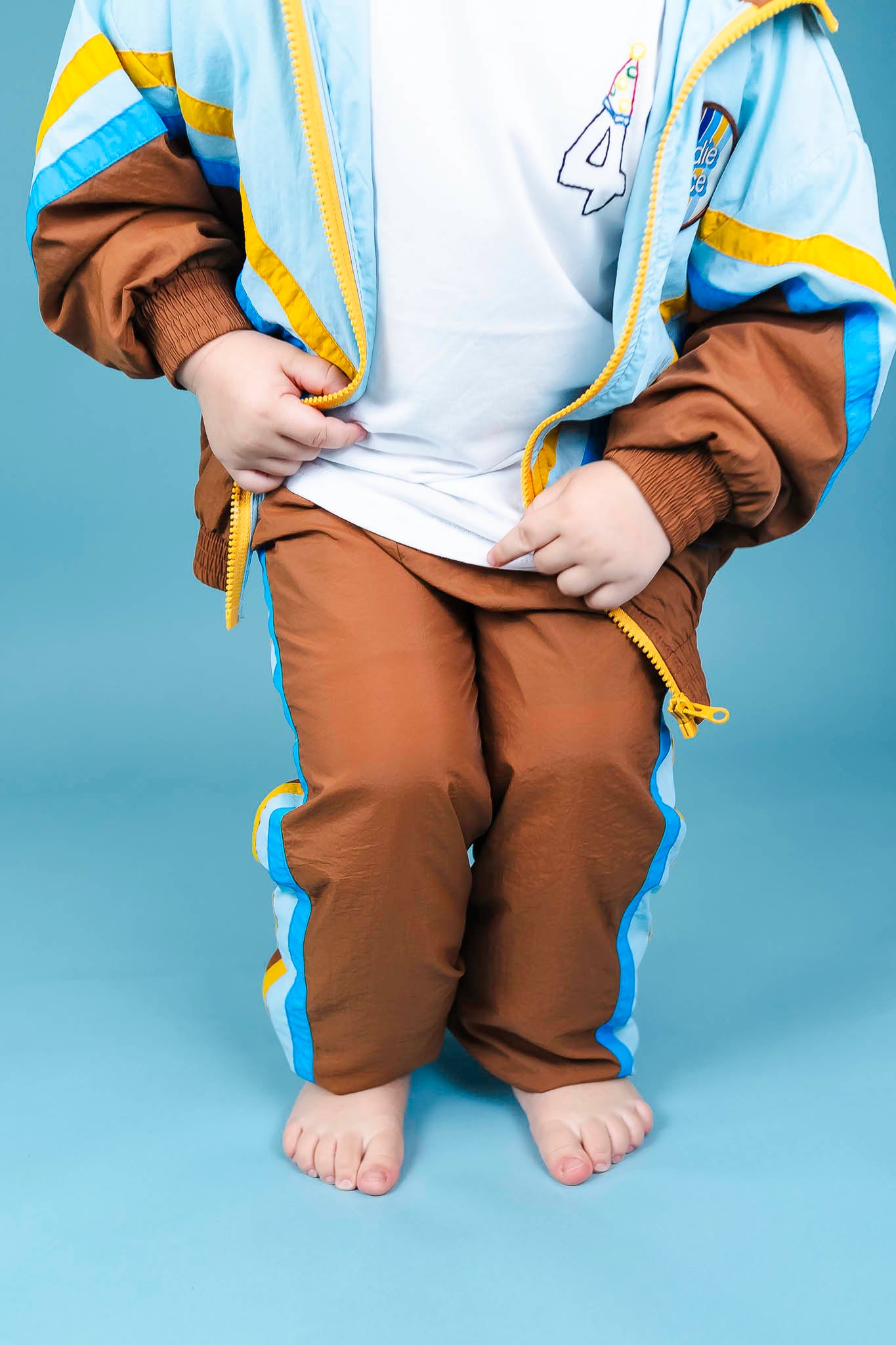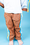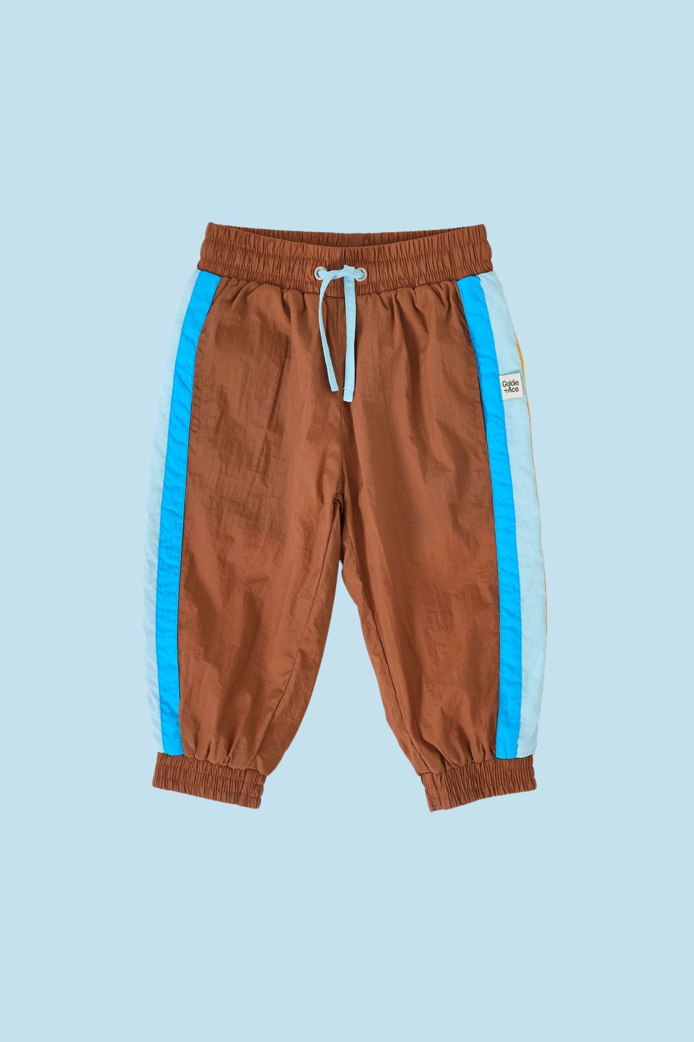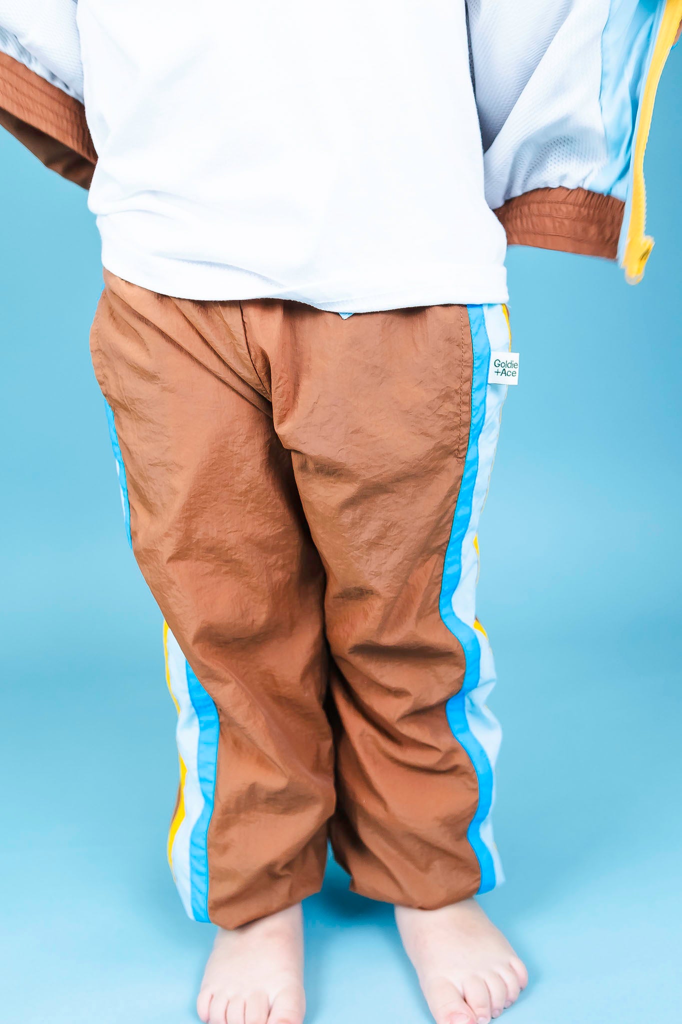 These lightweight track pants from Goldie + Ace come in brown and features blue stripes down the sides of each leg. A drawstring at the waistband makes for a comfy fit.