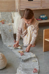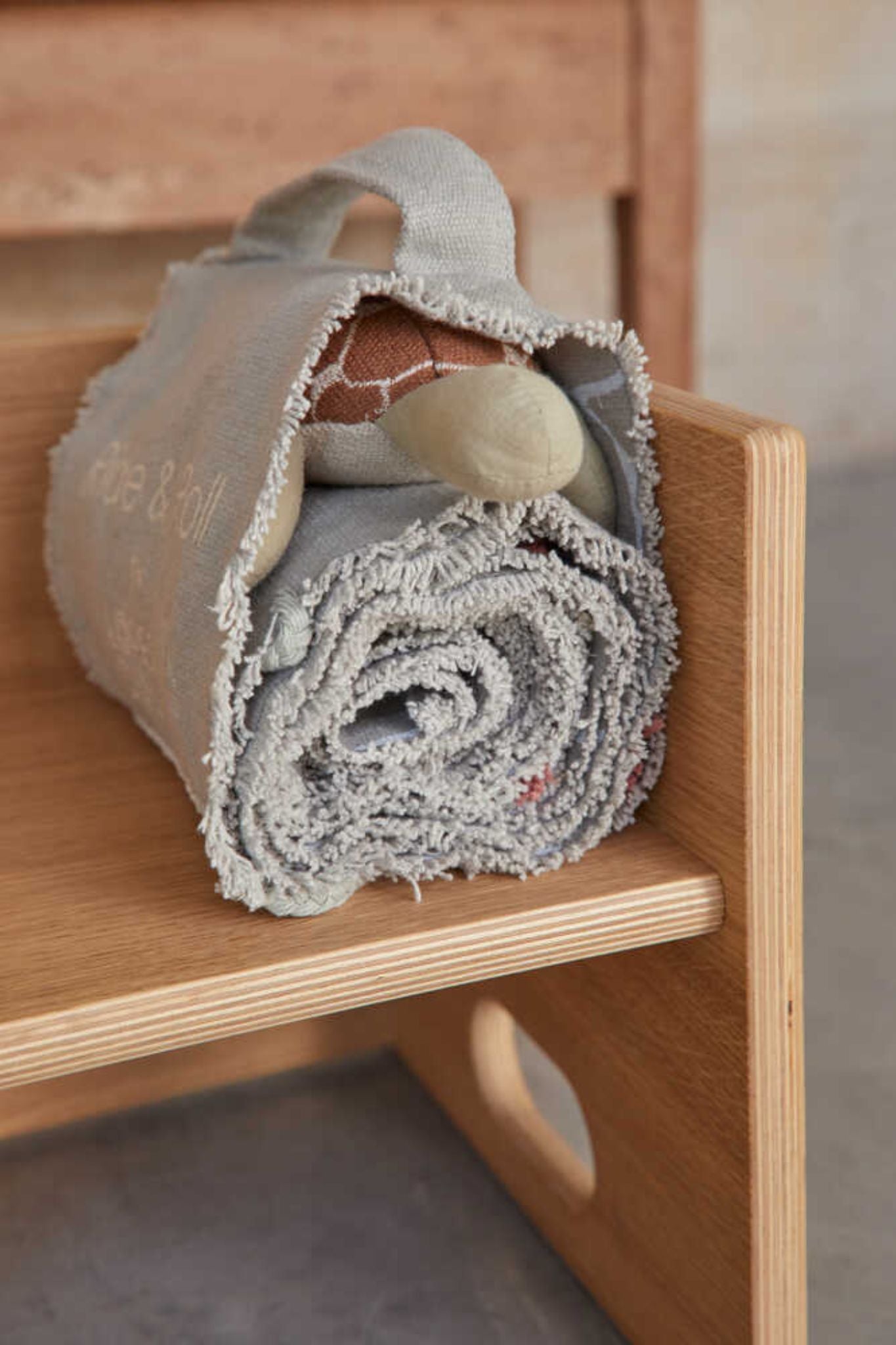 Embark on an ocean adventure with the Ride and Roll Turtle! This charming cotton canvas turtle features olive green feet and a beautifully embroidered shell. The turtle is nestled inside a thirteen foot long, blue-sage canvas roll. The roll is adorned with a vibrant underwater scene, complete with colorful corals and water reflections. With braided strings at the edges, it's easy to roll up and secure the turtle inside, transforming it into a handy briefcase that you can carry along on your adventures!