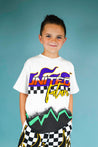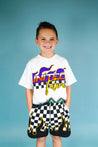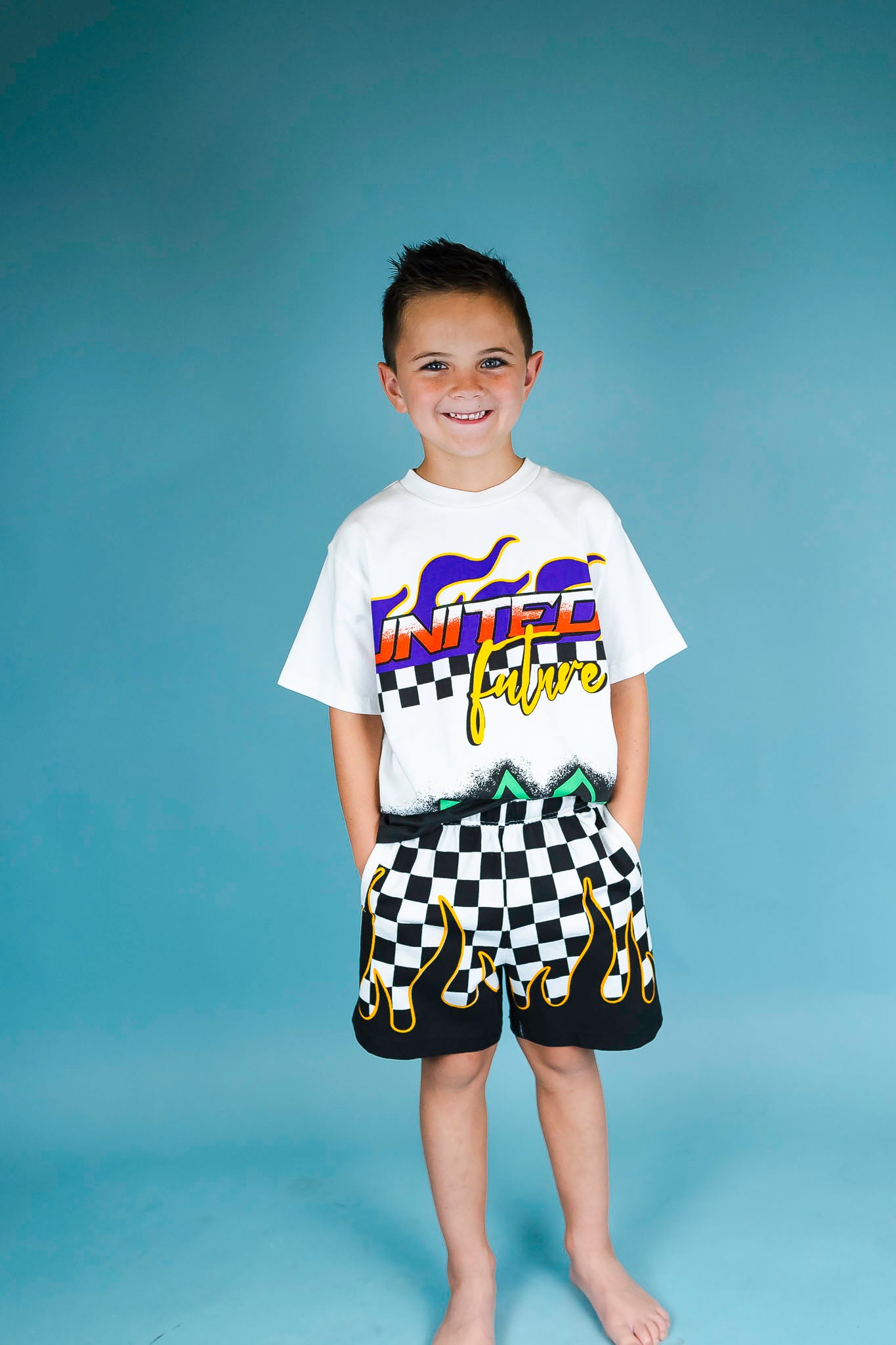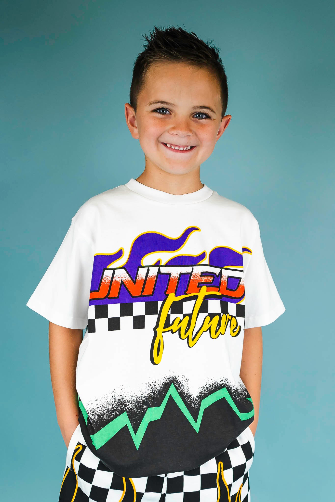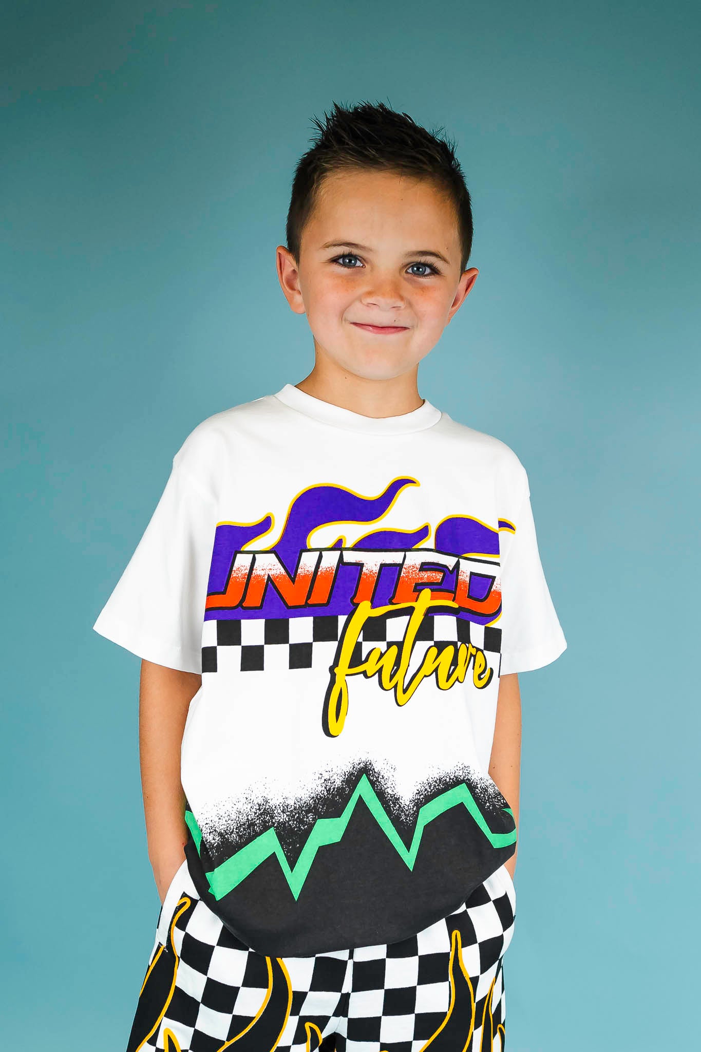 This ultra-cool tee by Molo comes in white and features a checker flame graphic with the words, 'United Future' across the front. Add a pair of laidback shorts for an easy summer outfit!