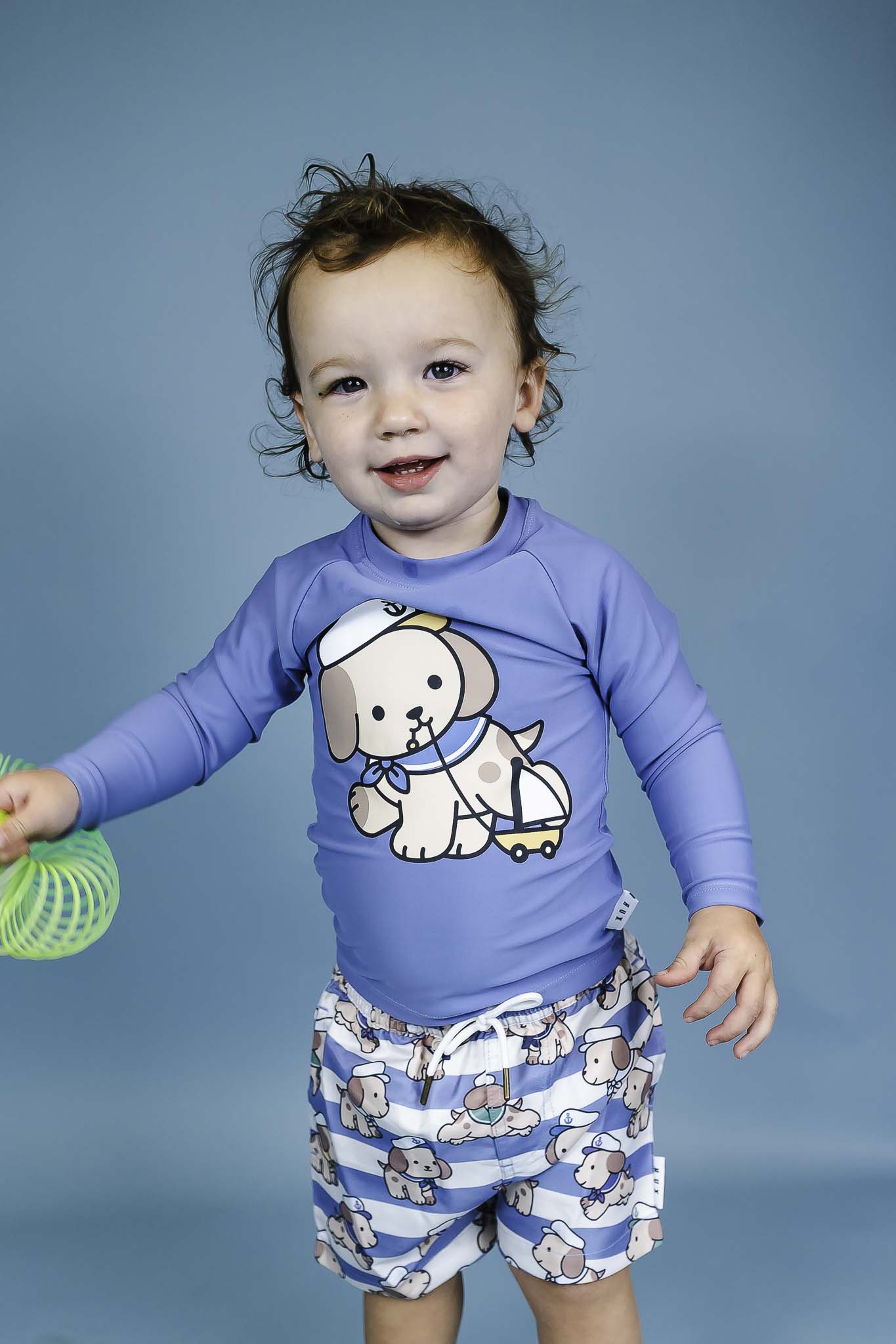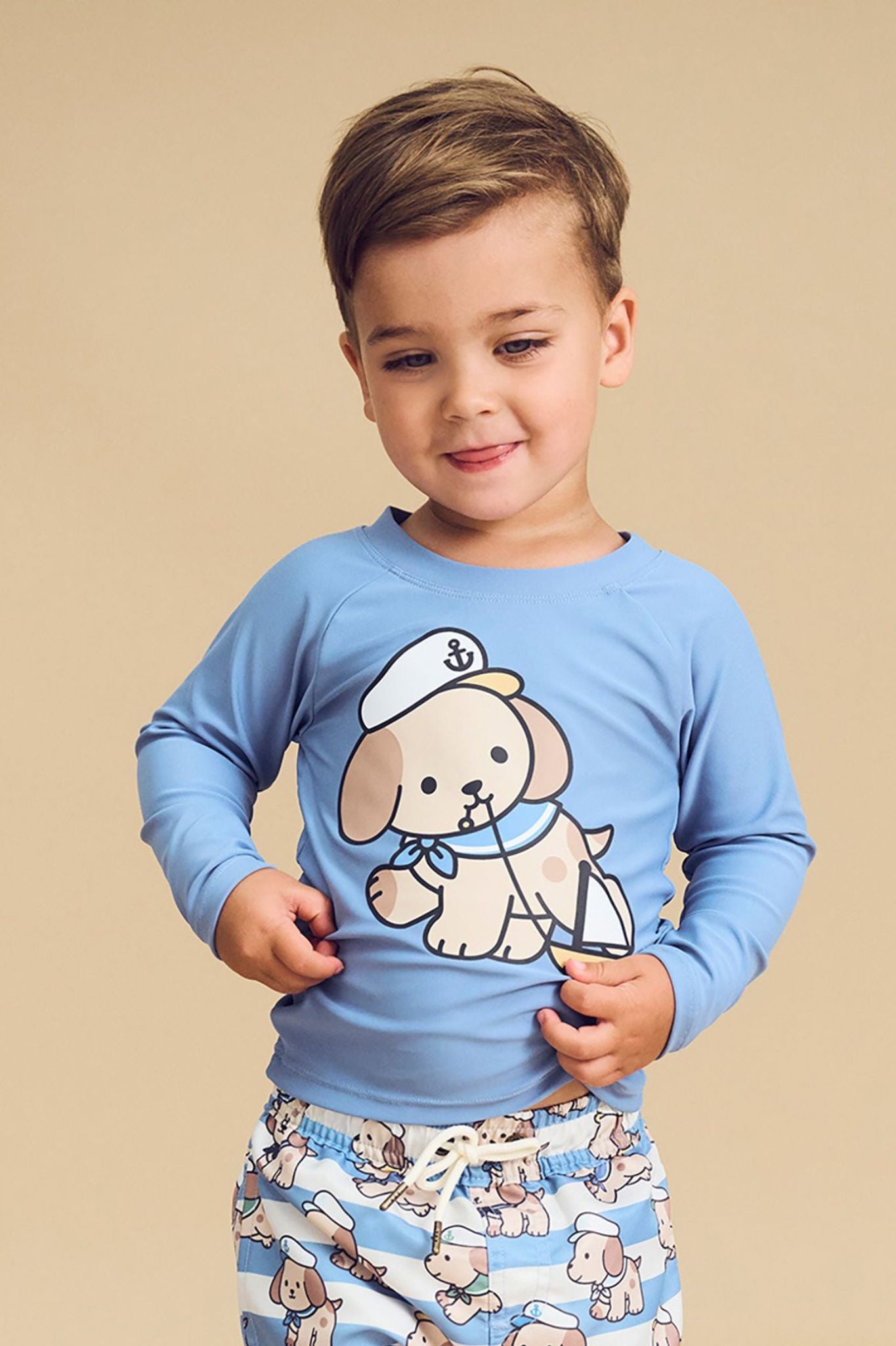 Sail into long summer days with this unique rashguard top from Huxbaby! It comes in blue and features an adorable sailor pup printed at the front. Long sleeves make for great sun protection.