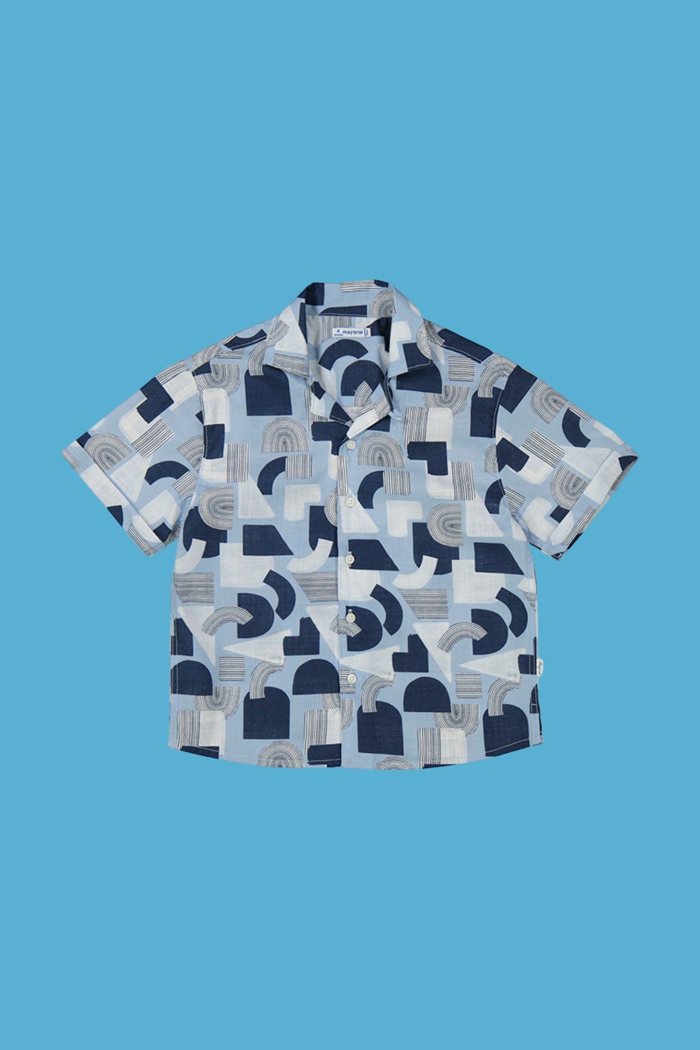 This fun shirt from Mayoral features a unique shape print, short sleeves, and a collar. Buttons line the center front.