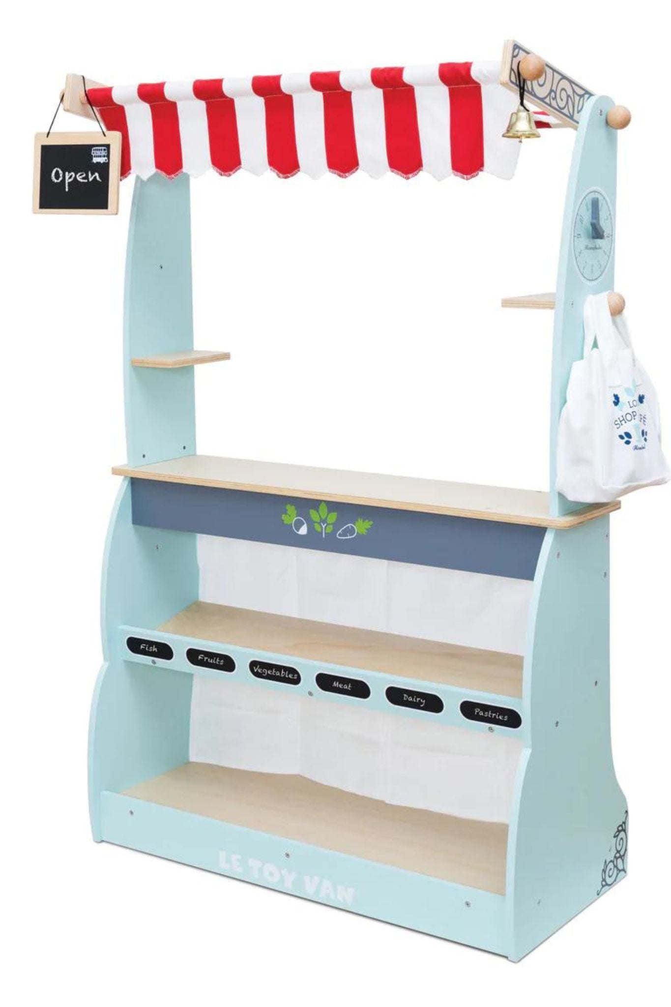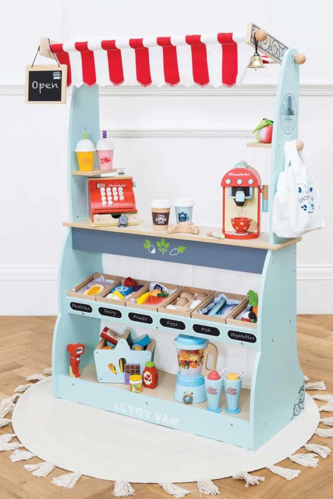 Pretend play has never been more fun! The Shop & Cafe from Le Toy Van comes in a baby blue hue and features a red-and-white striped awning. It is outfitted with a bell, clock, chalkboard sign, shelves, and a shopping bag.