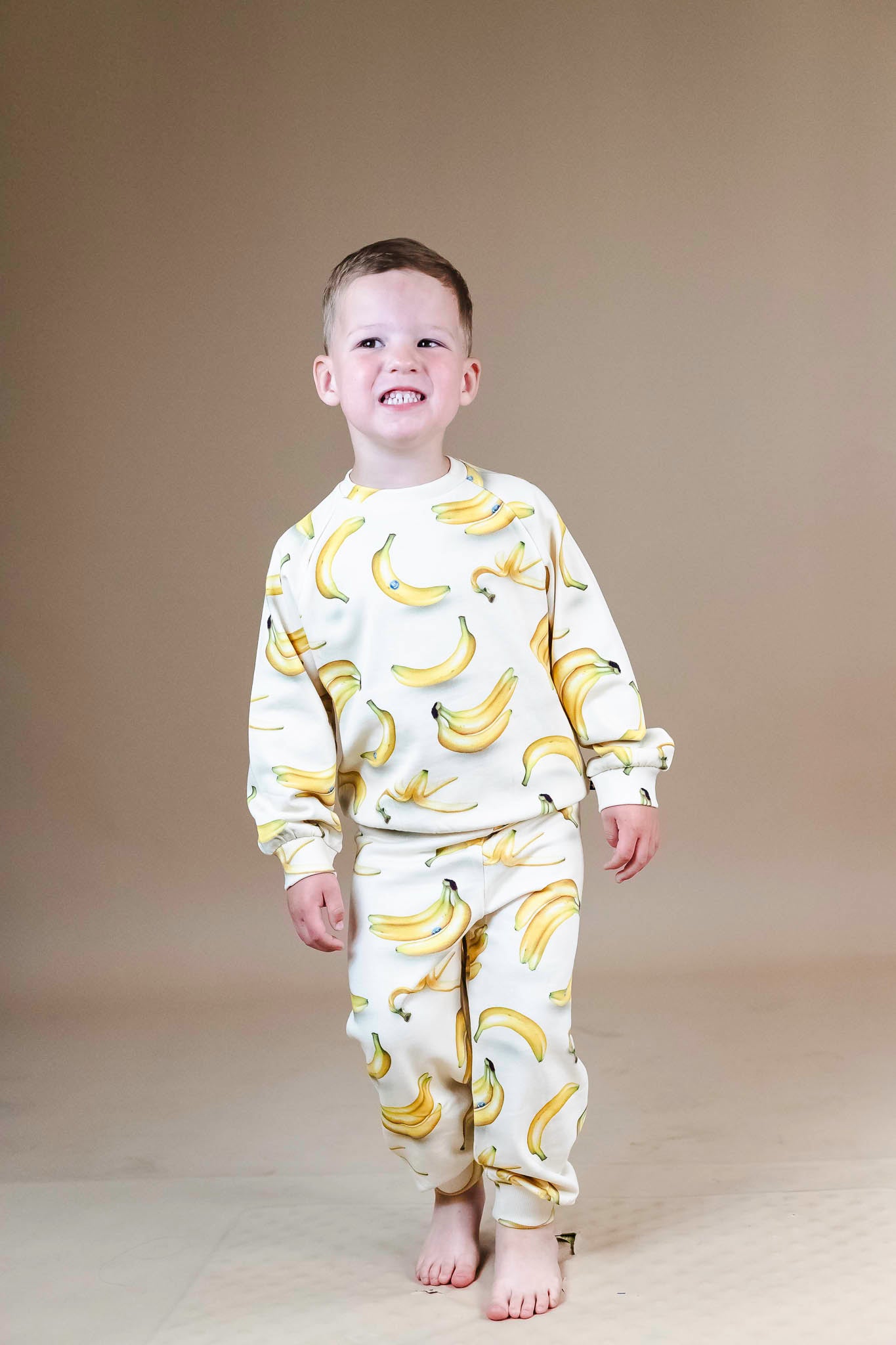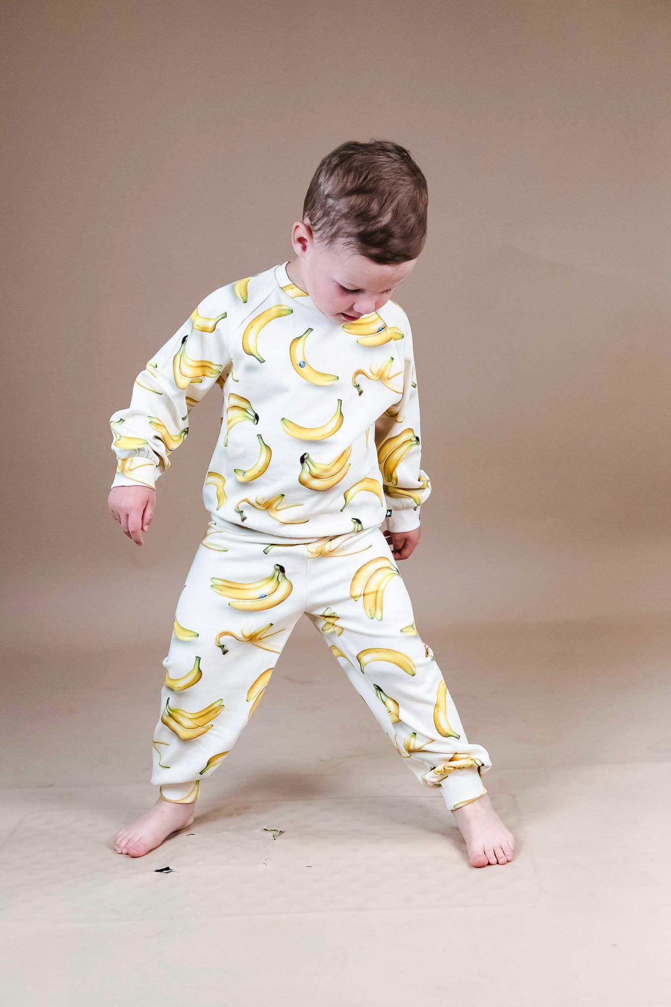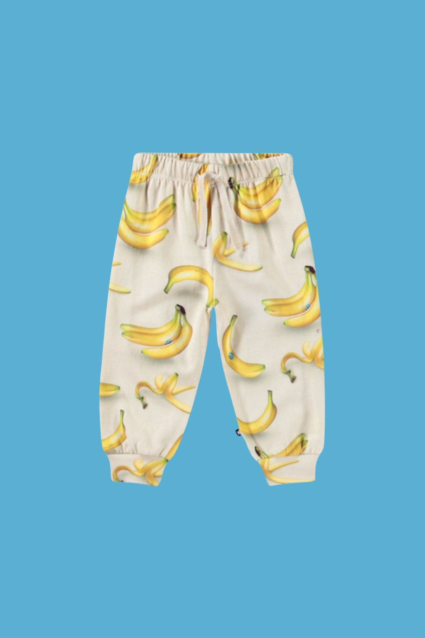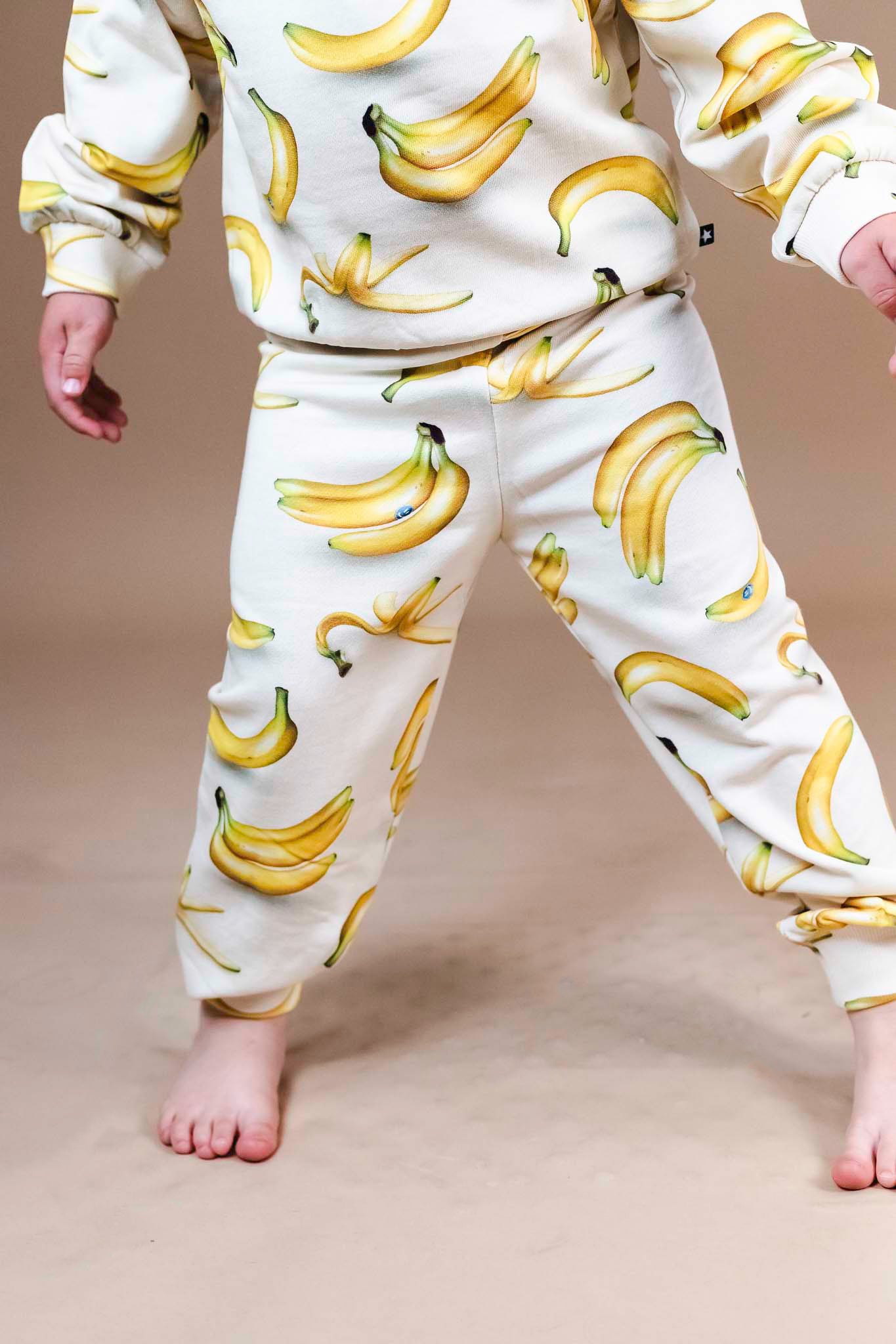 This cozy sweatpant from Molo will make you go bananas! It features a drawstring waist and allover banana print.