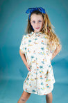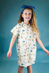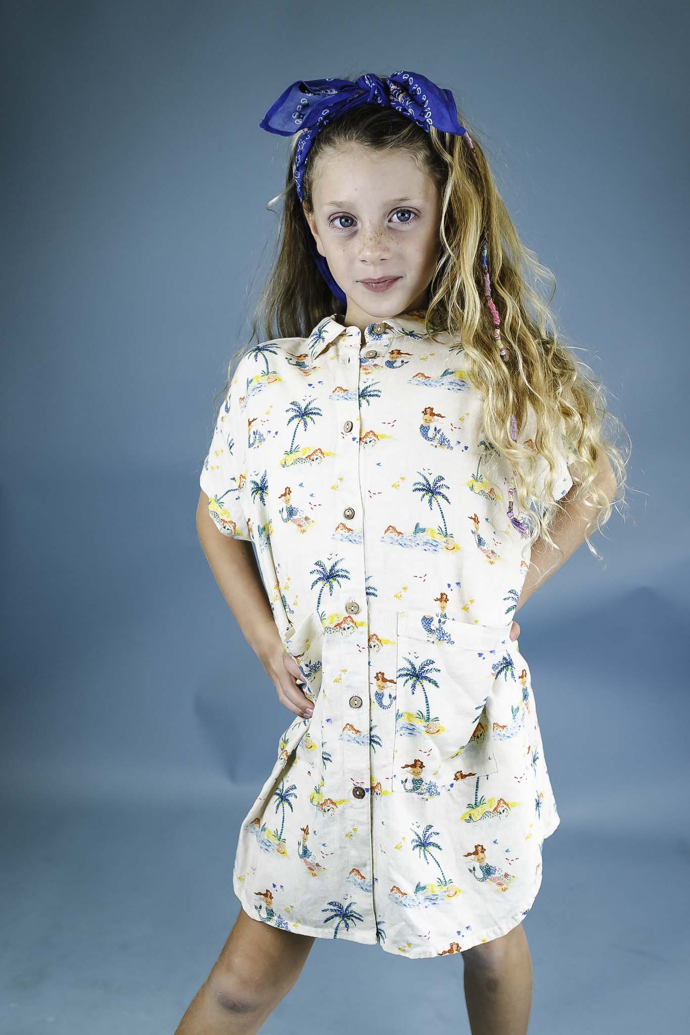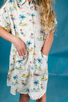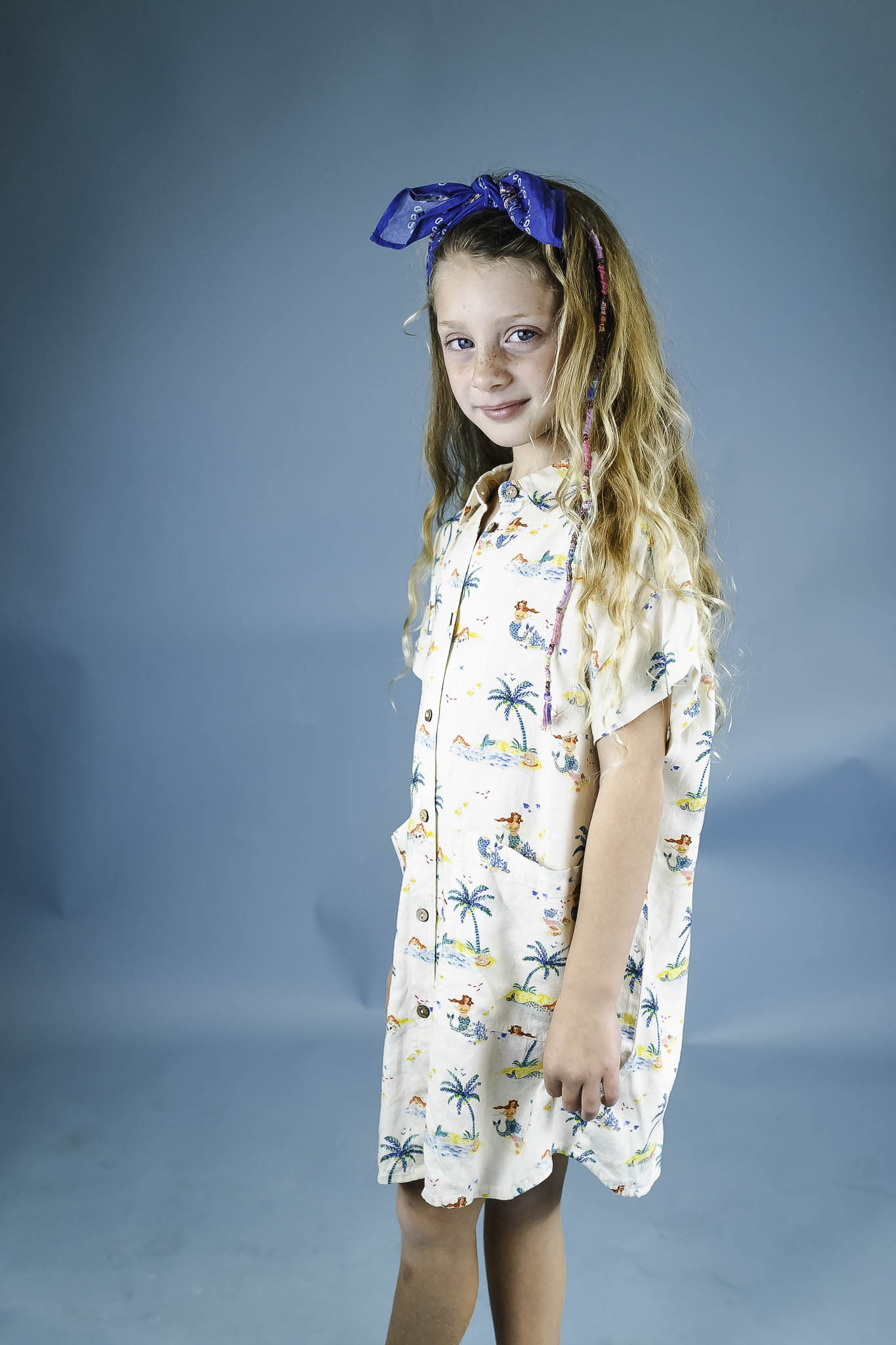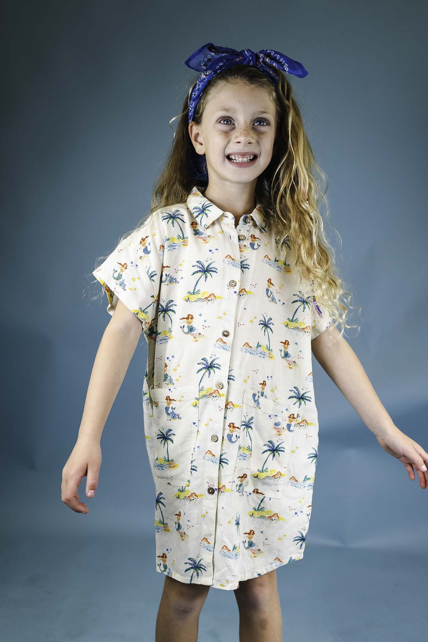 This tropical button-up dress by Arsene is perfect for vacay! It features short sleeves, a collar, and an allover mermaid print.
