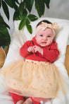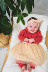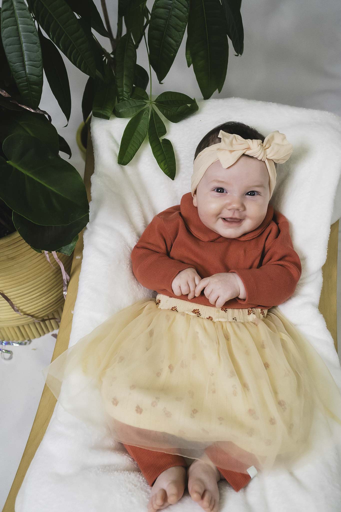 Outfit baby girl in this gorgeous skirt from Riffle! It comes in a light-yellow hue and features a dainty floral print. A layer of tulle flows from the floral waistband, giving off ethereal vibes.