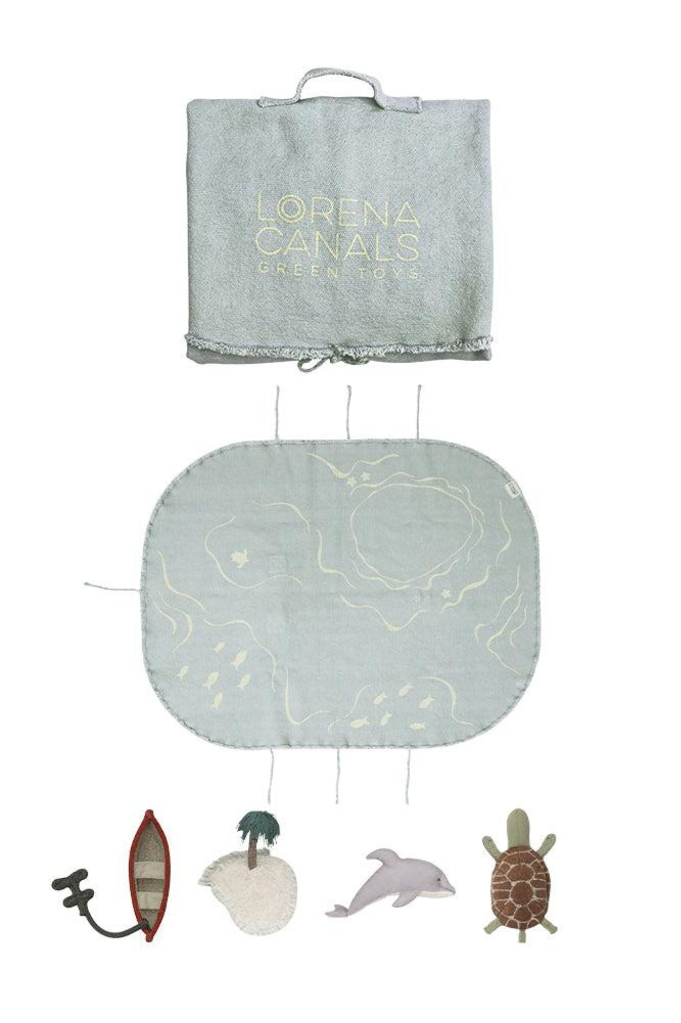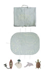 Set sail on your very own desert island adventure! This textile toy set is designed to ignite creativity and interactive play. The base easily folds up and ties, transforming into a portable briefcase that keeps all the accessories neatly stored for fun, on-the-go play! The Aqua Blue canvas features printed fish and wavy patterns, mimicking the gentle movement of the ocean.