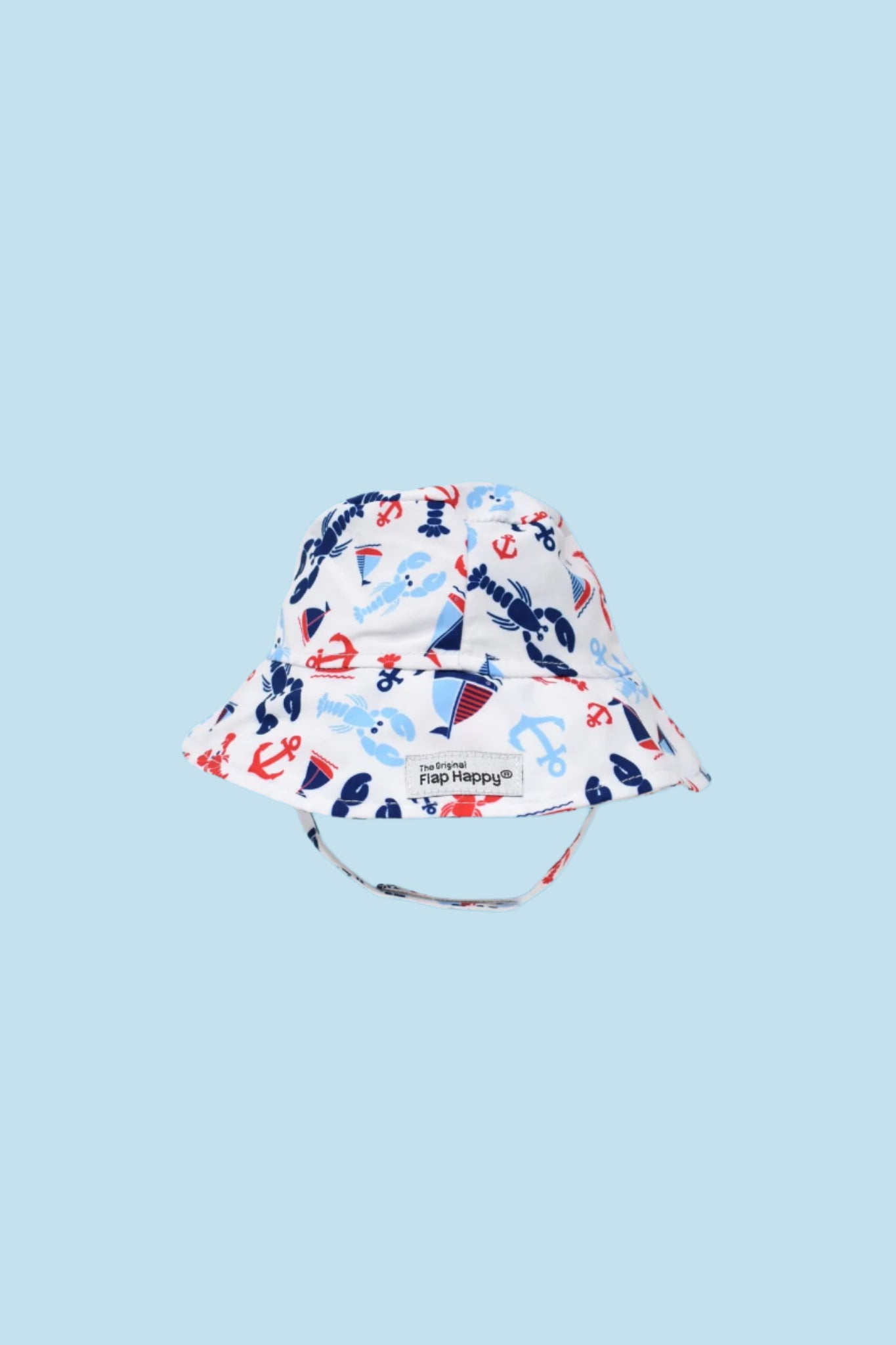 Sail into sweet summertime with this adorable bucket hat from Flap Happy! It features an allover sailboat print and a chin strap. UPF 50 aids in sun protection.