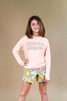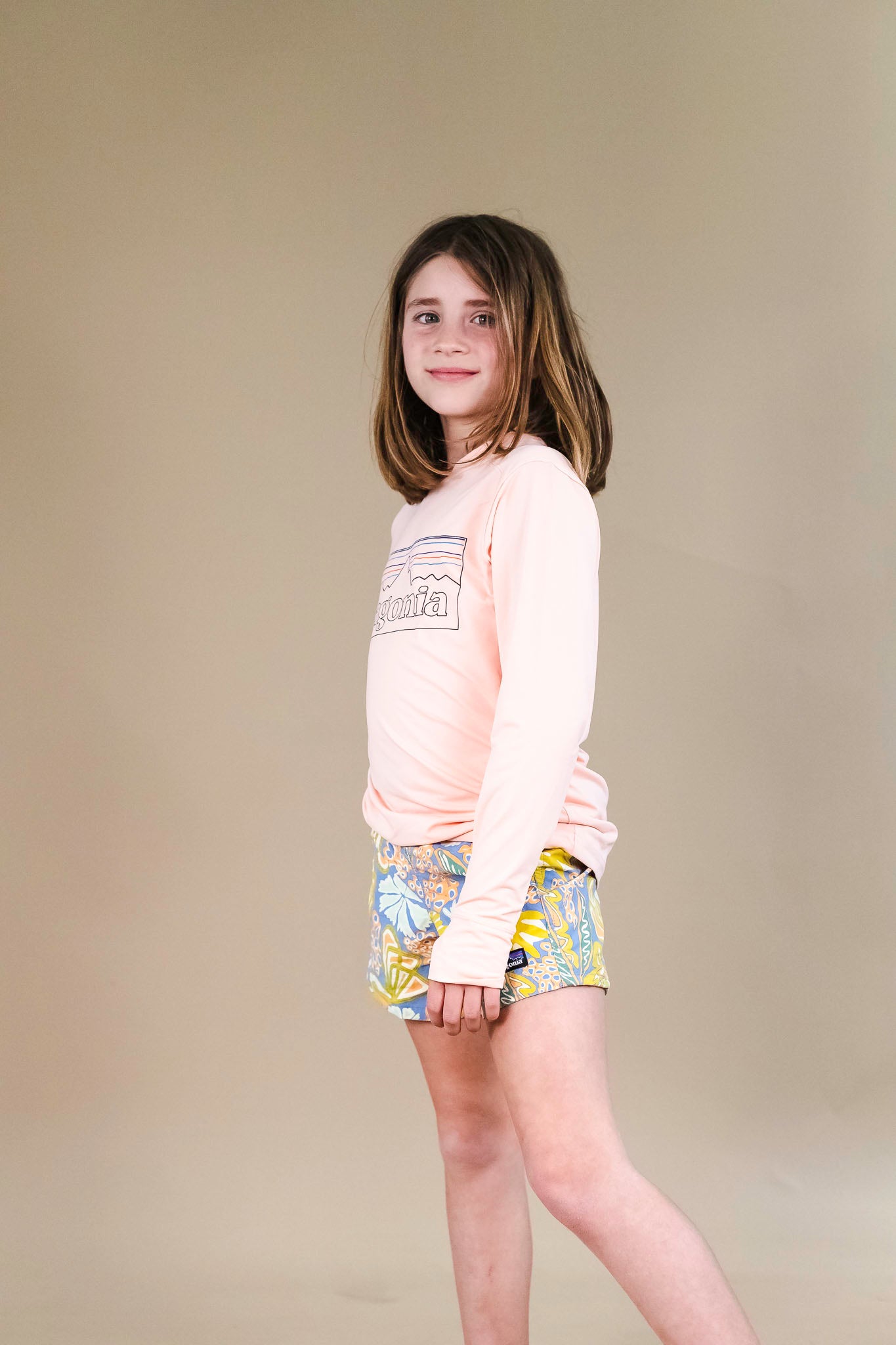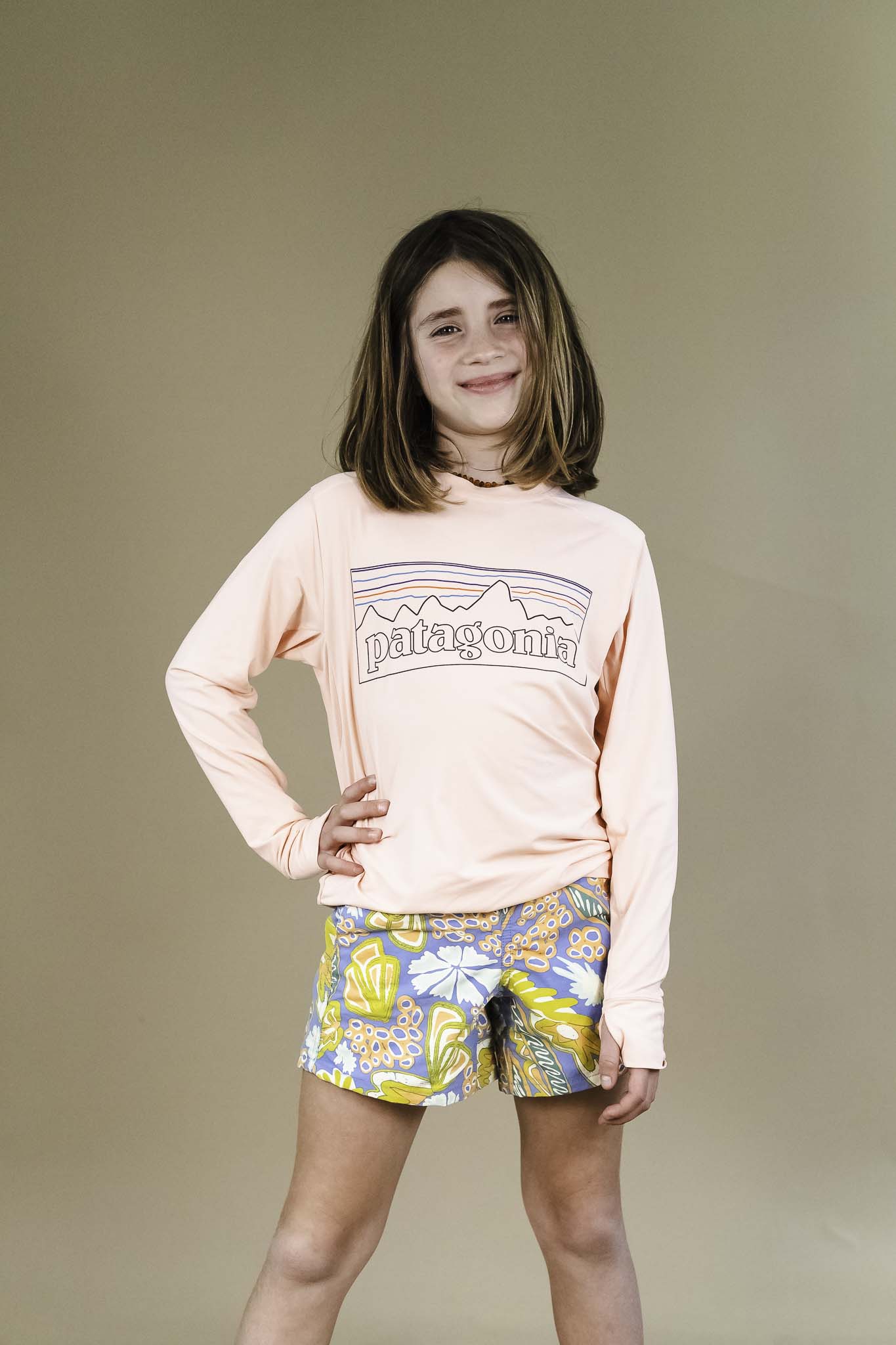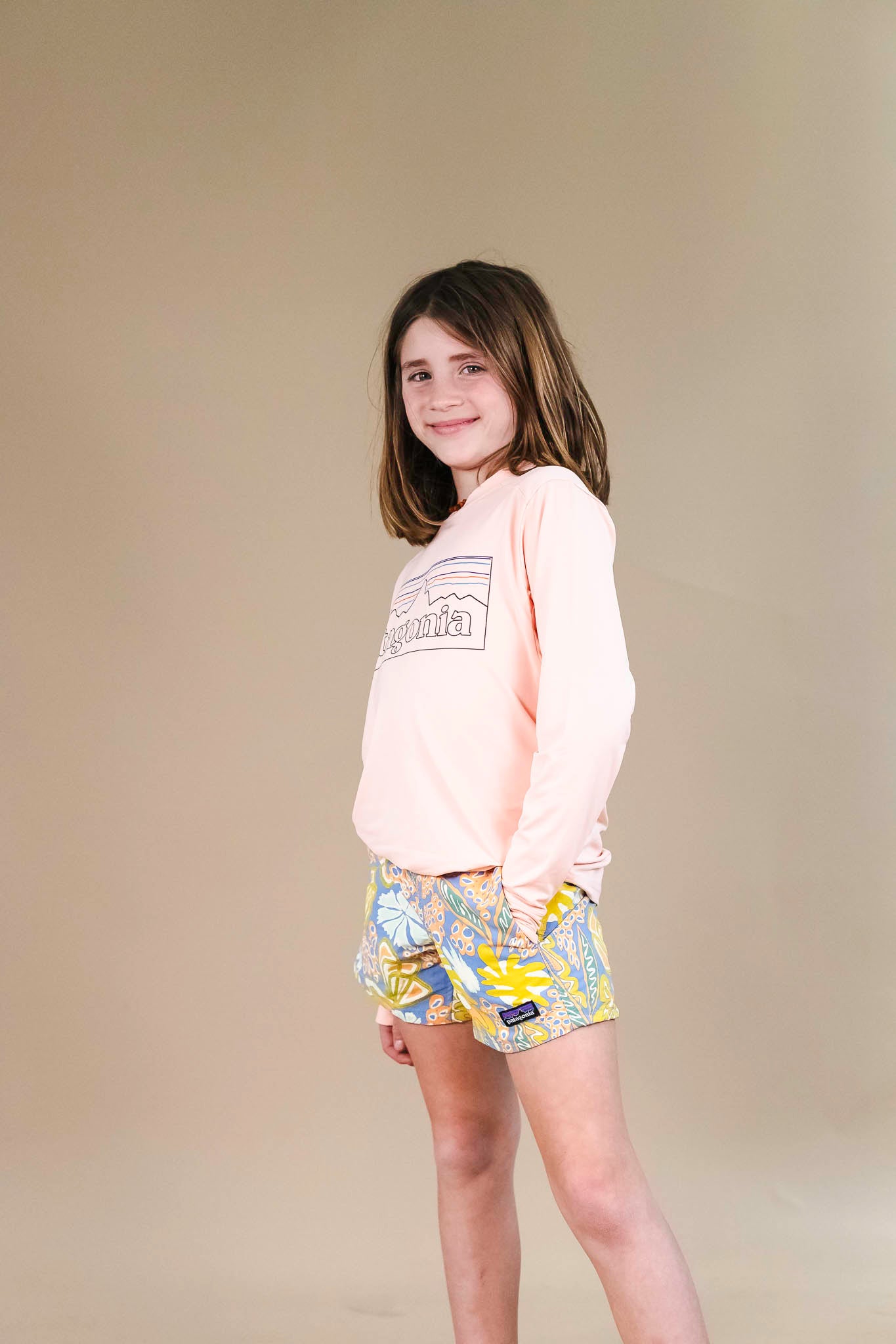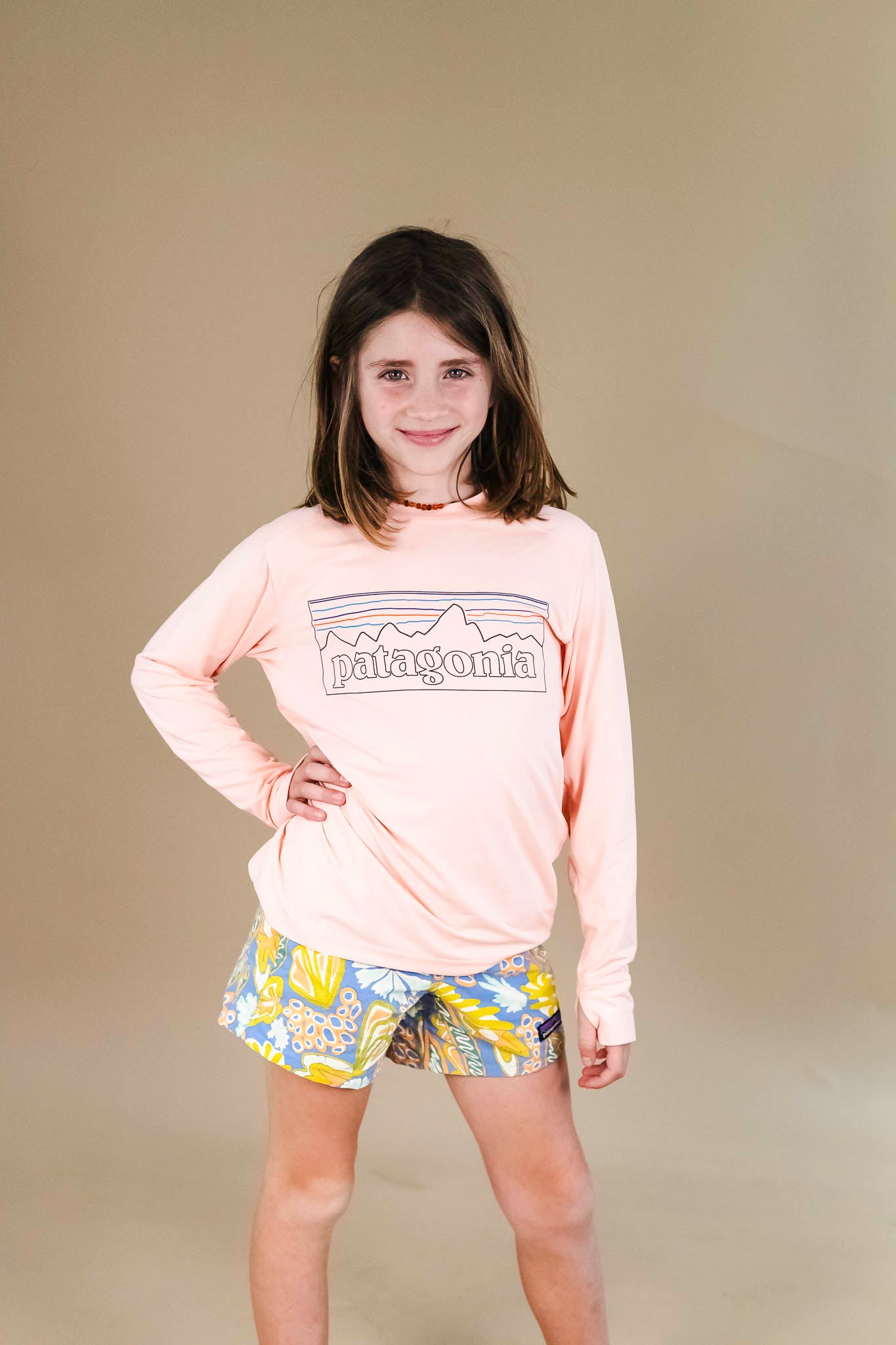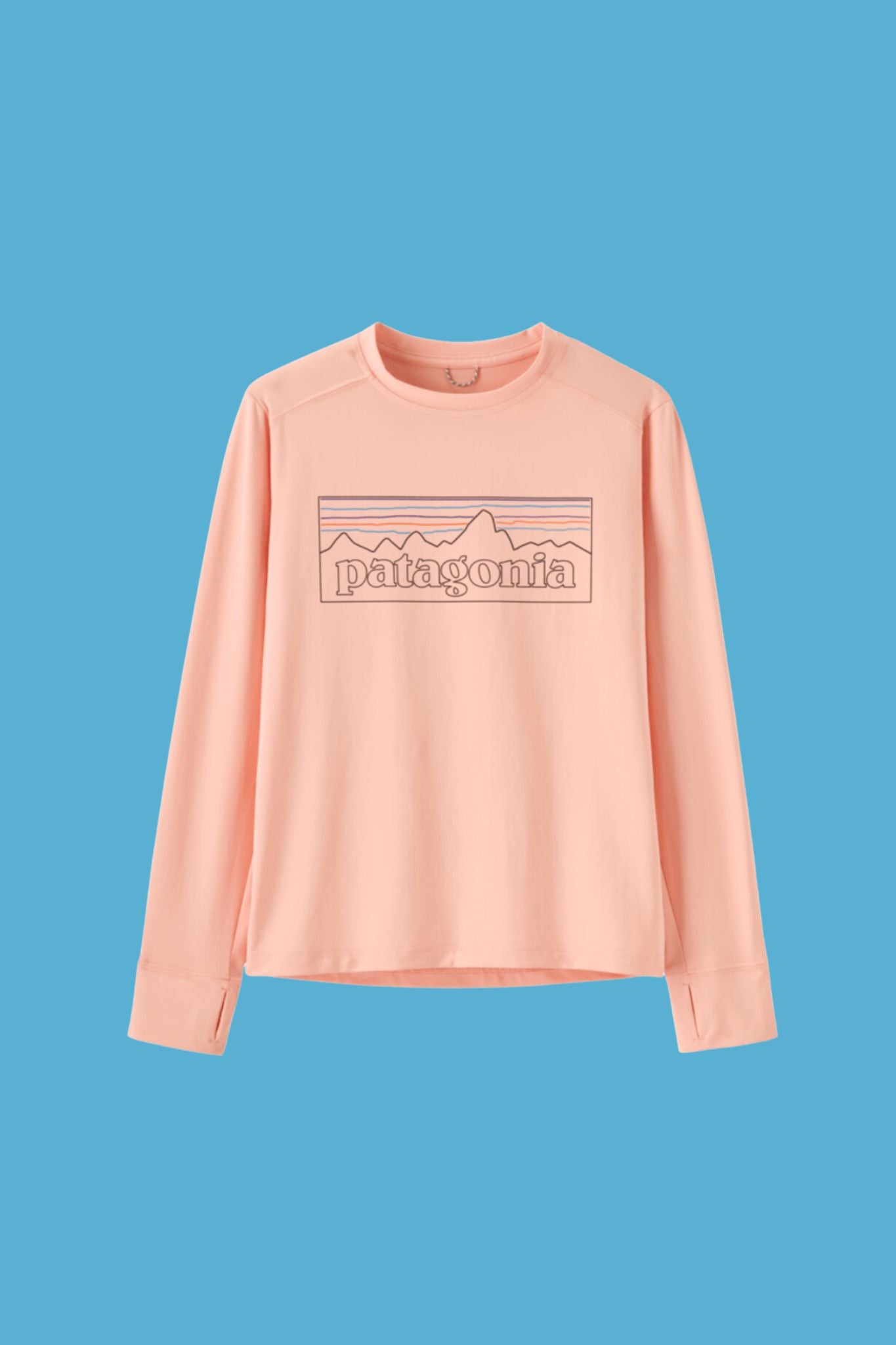 This comfy, long sleeve tee from Patagonia comes in light pink and features a mountain graphic on the chest. The brand name is written within the graphic.