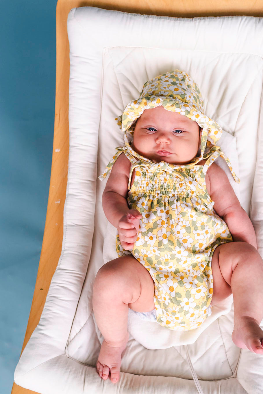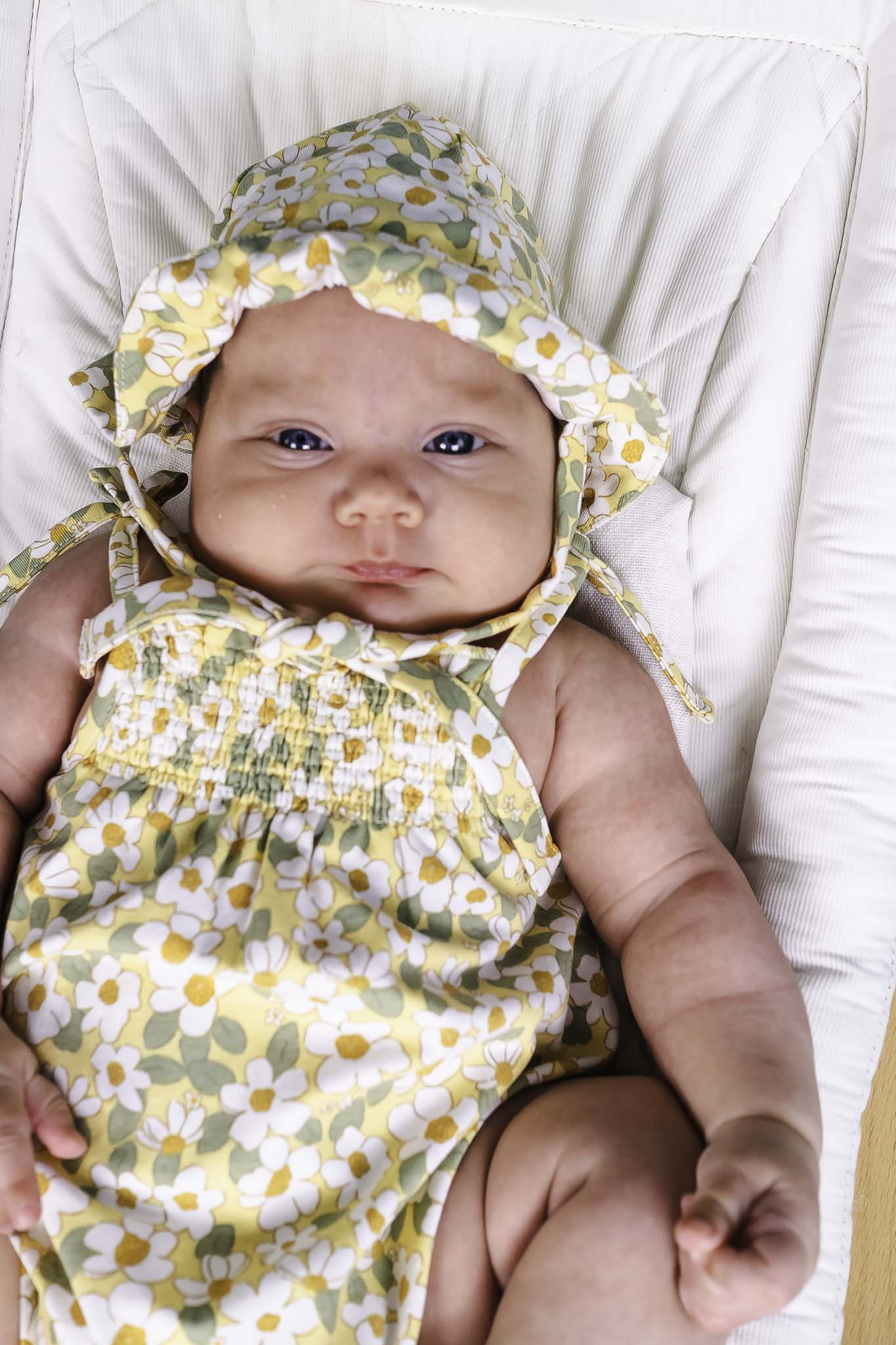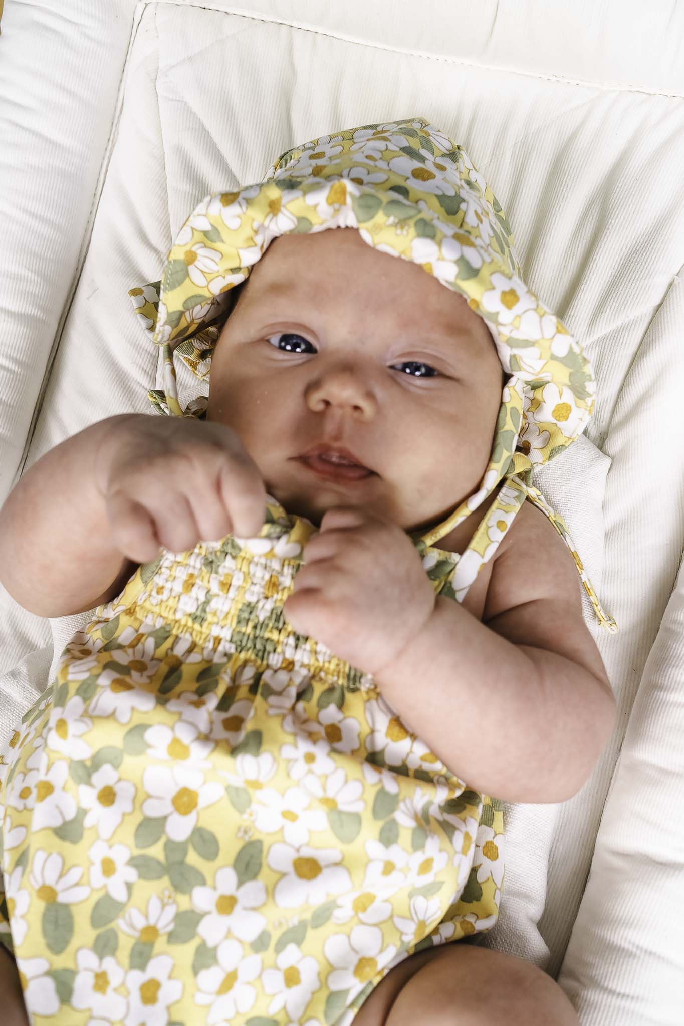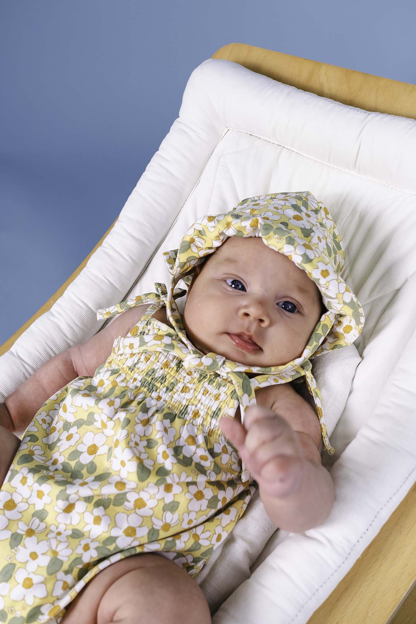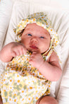 This happy set from Mayoral Newborn includes a hat with a chin tie and a bubble romper. Both pieces feature a vibrant floral print in yellow.