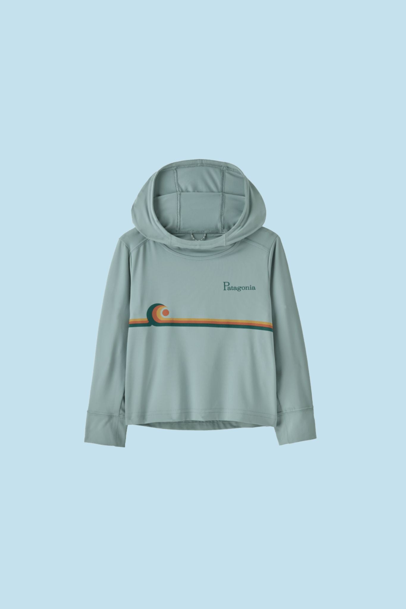 This Patagonia sweatshirt takes your little one from the ocean to the mountains! It offers sun protection, a hood, and a swell graphic along the front body.