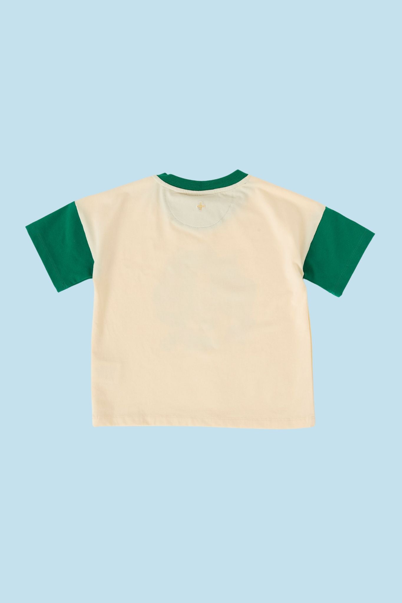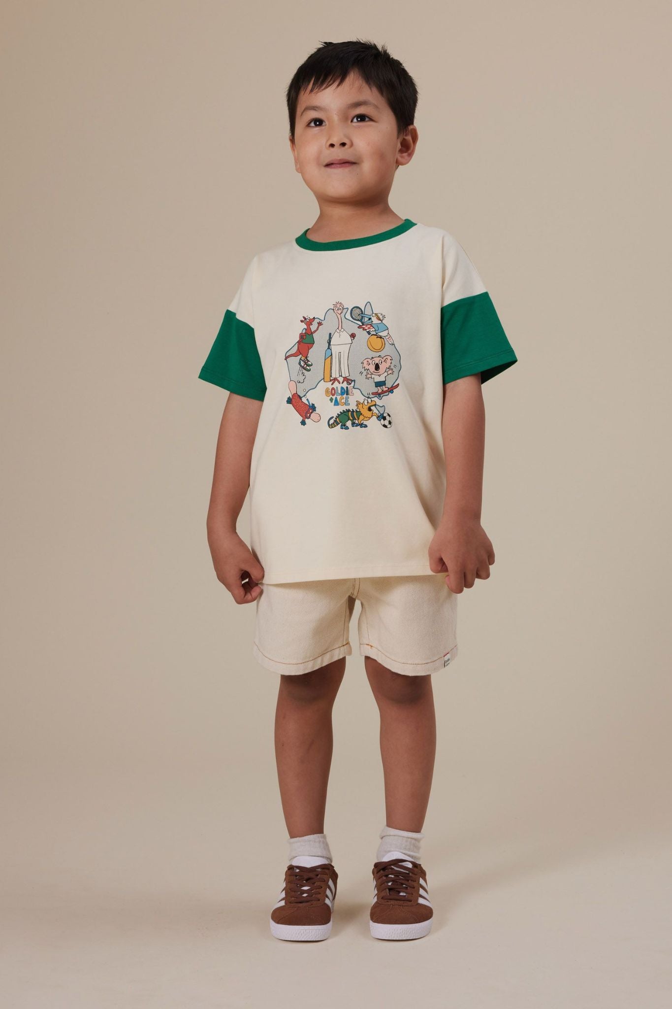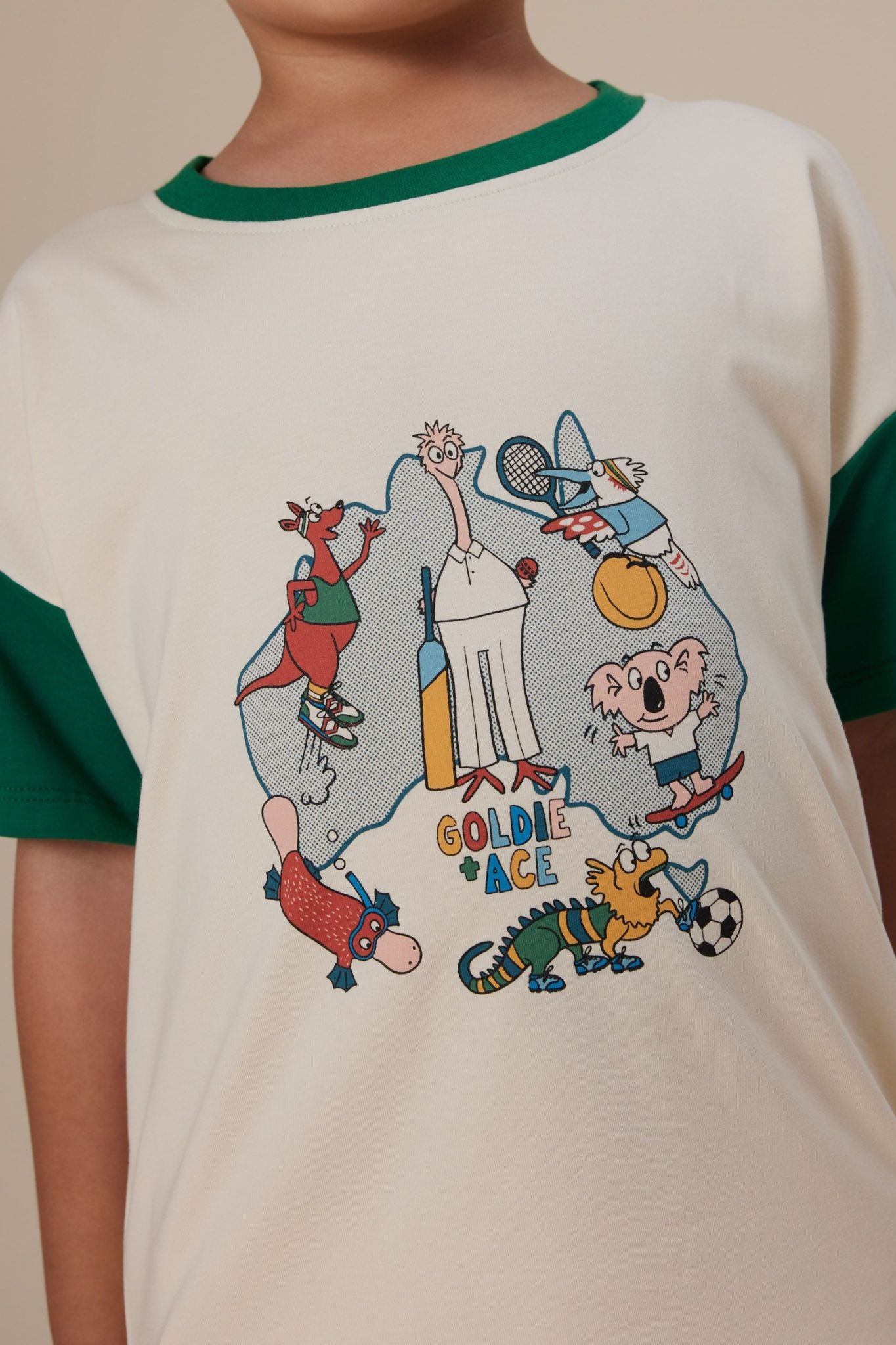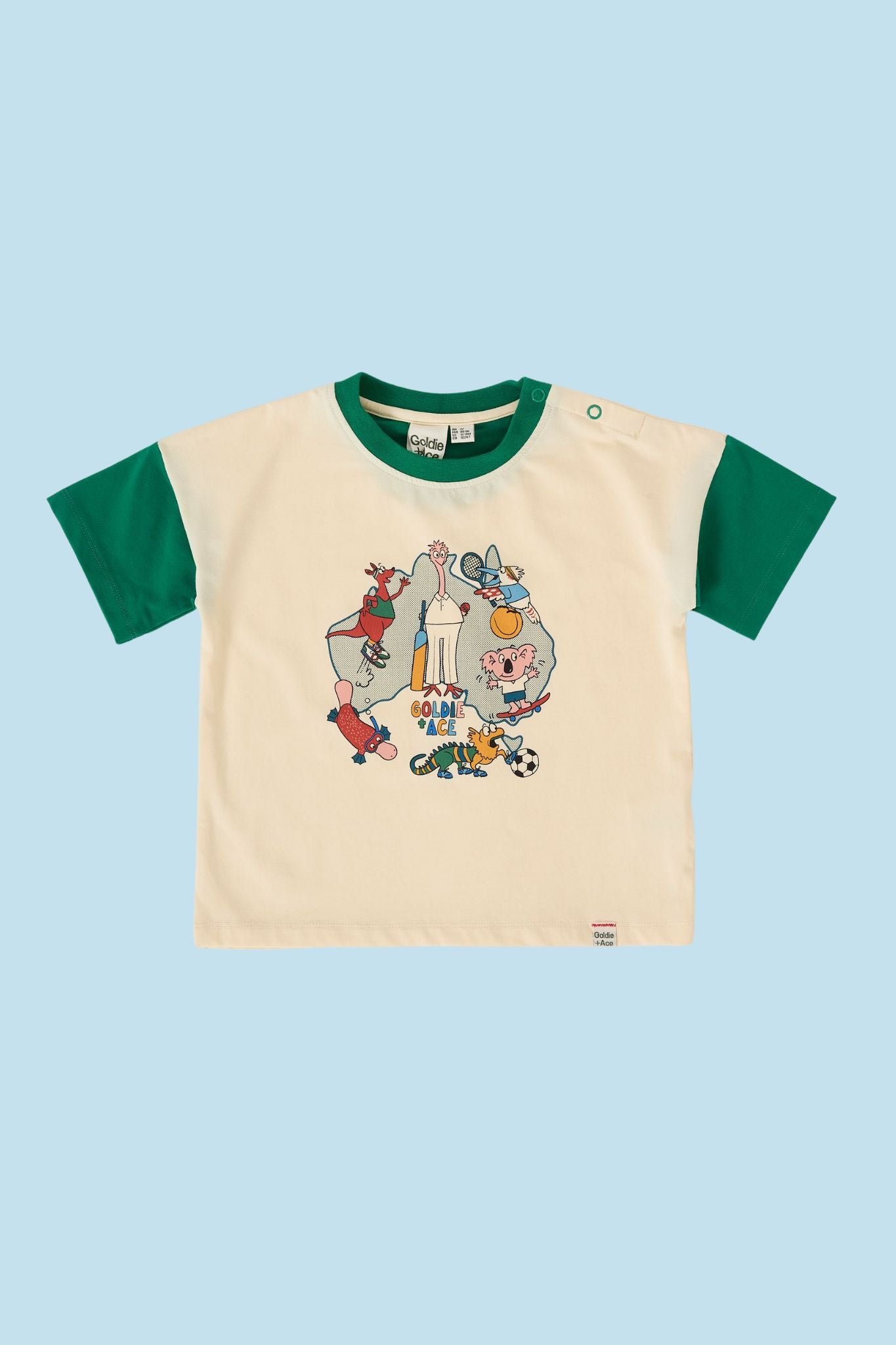 Team Goldie is made up of a bunch of fun, sporty animals! This Goldie + Ace tee features green, short sleeves, an animal graphic at the front, and a contrast neckline.