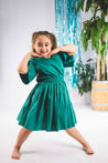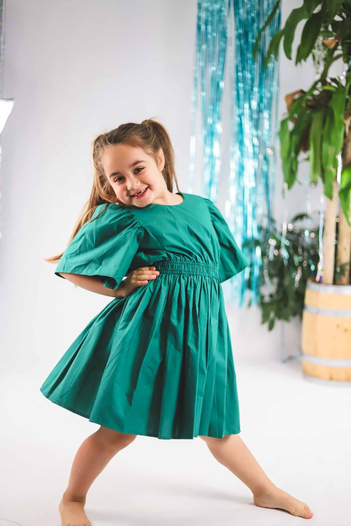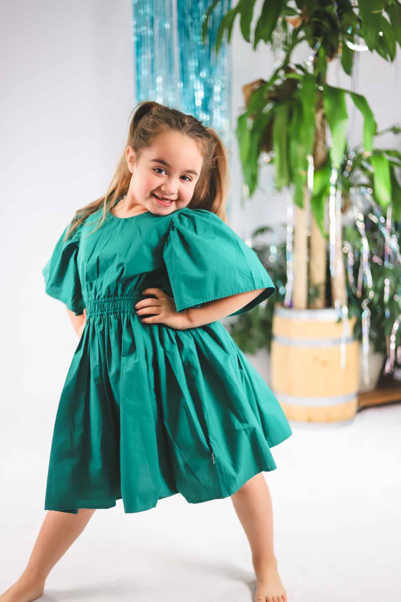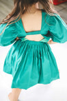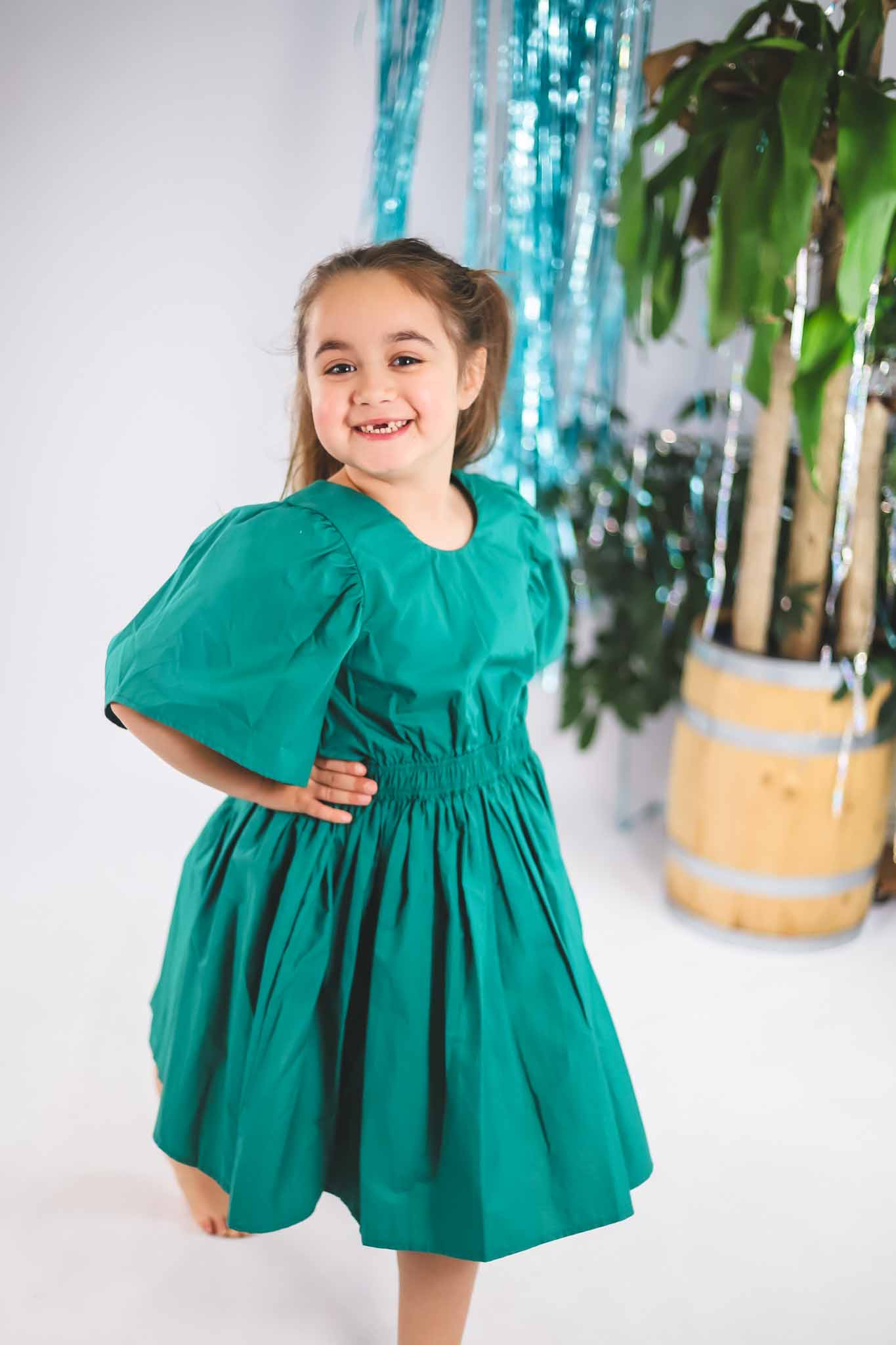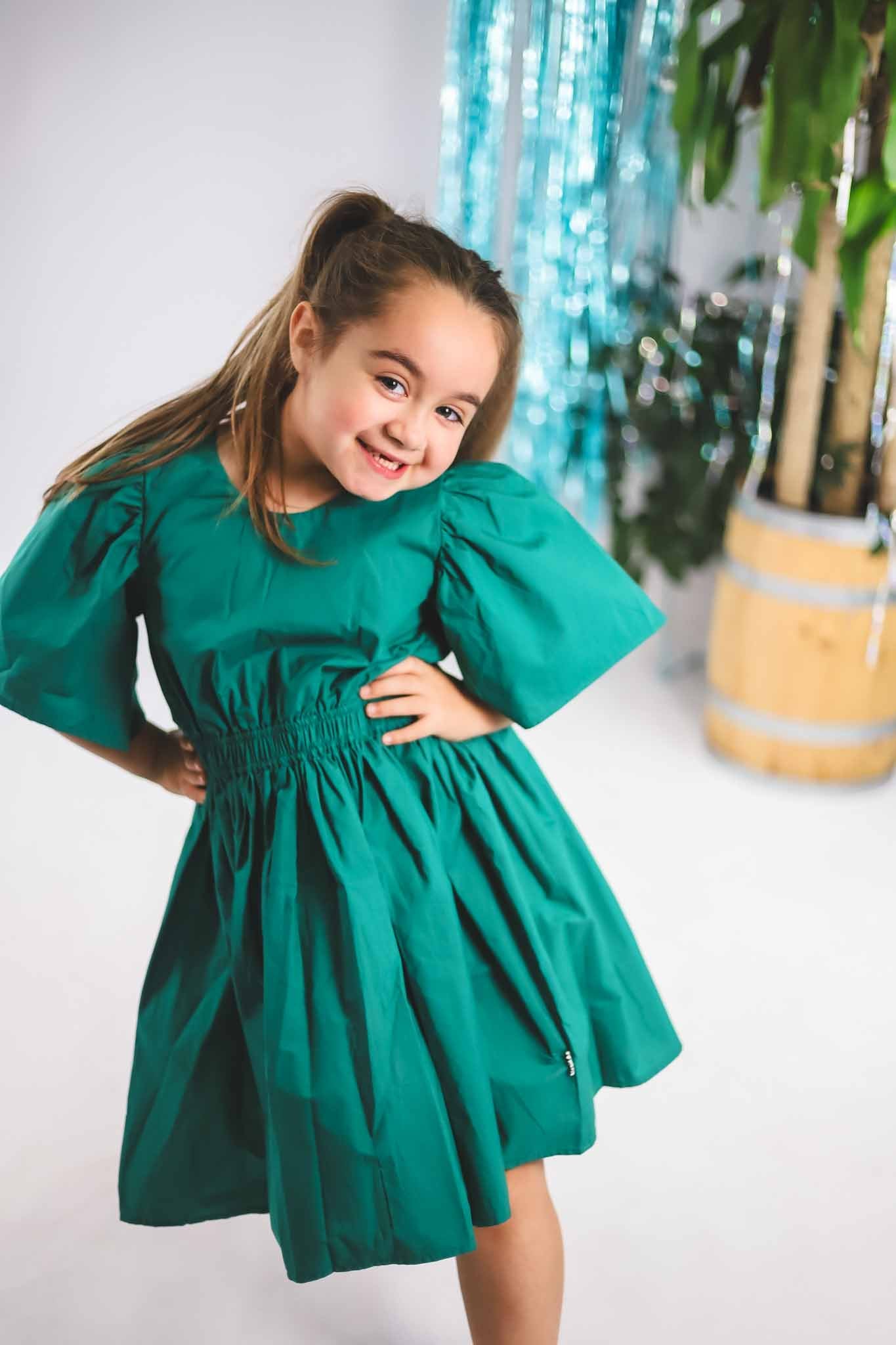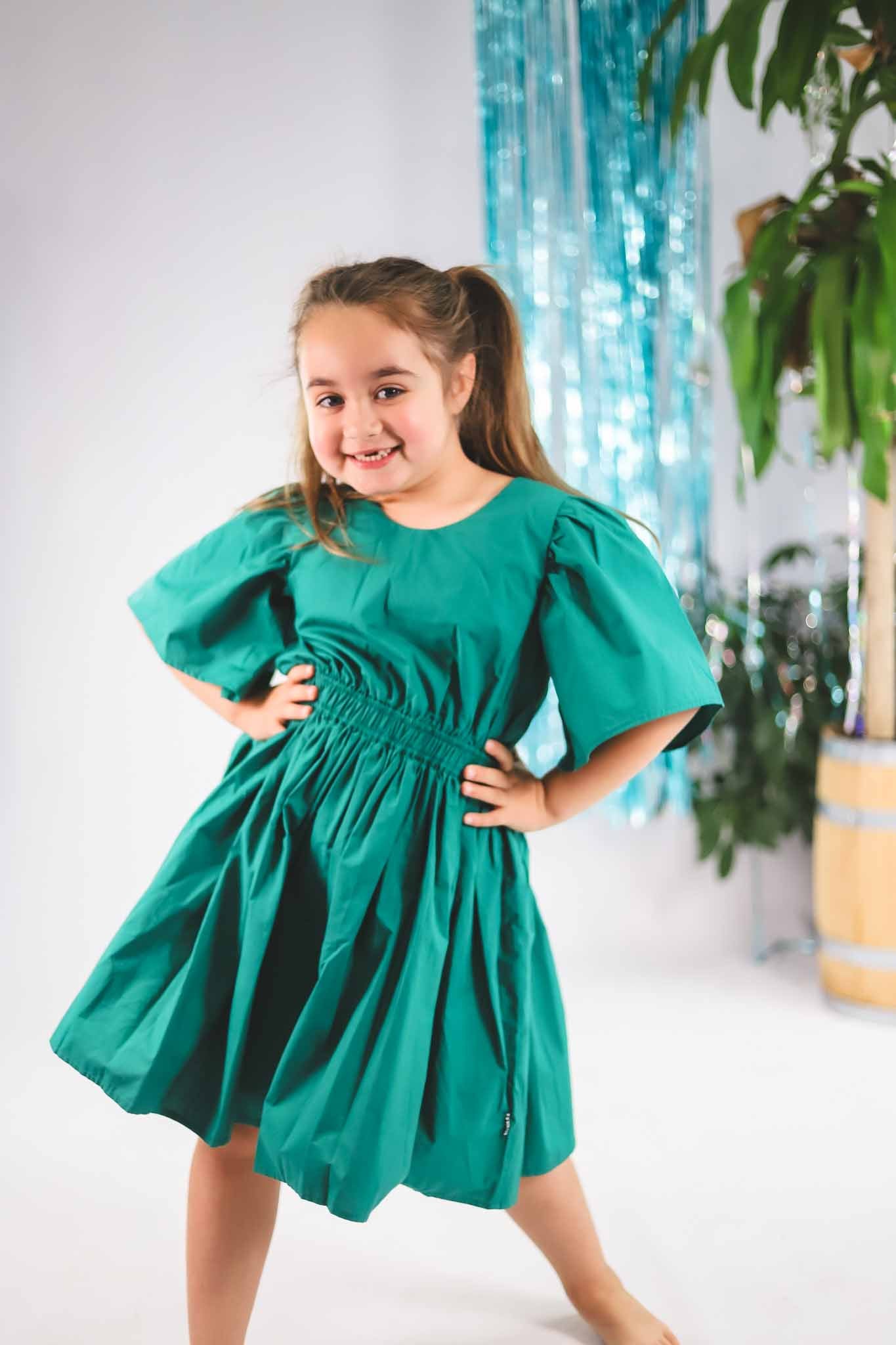 This gorgeous, emerald green dress from Molo is perfect for any special occasion! It features short, puff sleeves, smocking at the waist, and an open back silhouette.