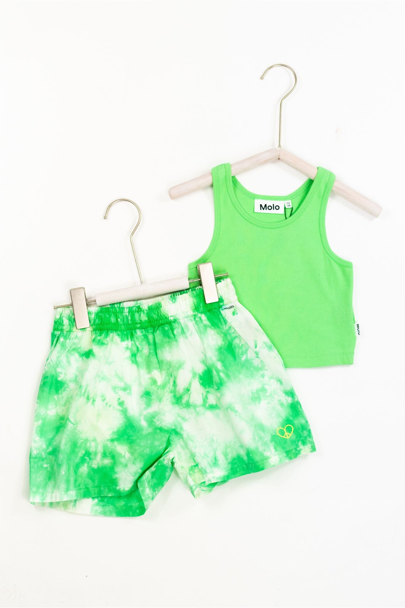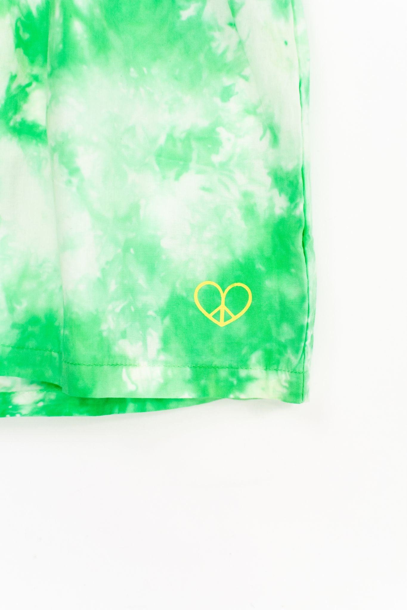 Stand out! These electric green tie-dyed shorts by Molo are made from 100% organic cotton and feature an elastic waistband. A petite peace sign heart graphic is situated just below one hip, while side pockets add functionality to these cute bottoms.