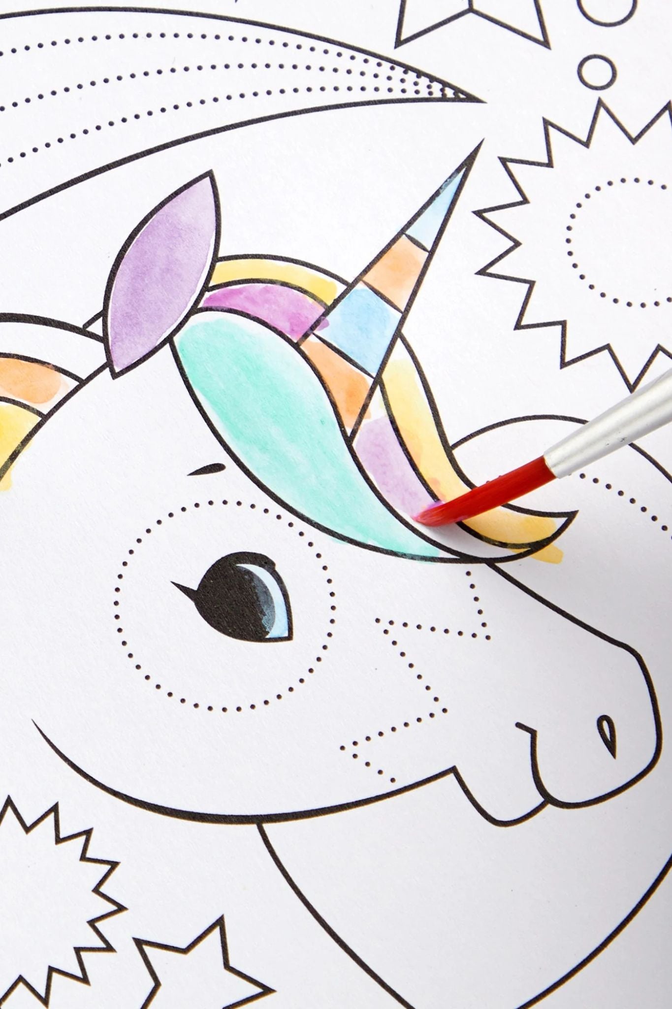 The Unicorn Dreams Painting Kit from Mudpuppy includes 10 paintable cards each with a unique unicorn themed illustration as well as a built-in watercolor paint palette at the top of each card and a watercolor brush which is neatly packaged in place with a cardboard insert at the back of the pad.