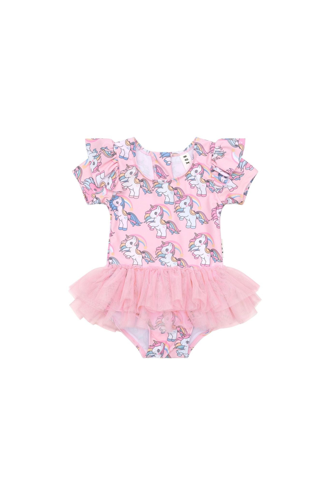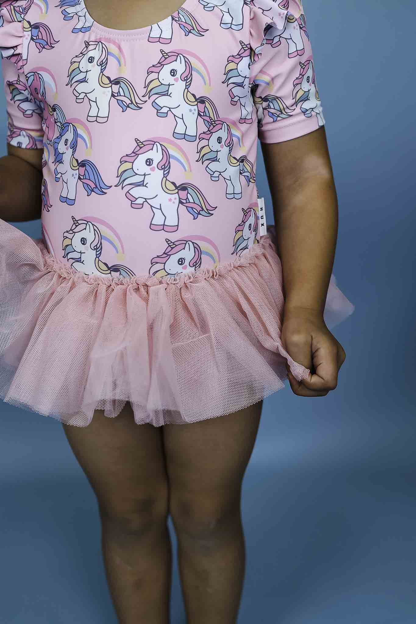 Outfit your little girl in this ultra-sweet swimsuit from Huxbaby! It features ruffles along the short sleeves, a rainbow unicorn print, and a unique, frilly skirt.