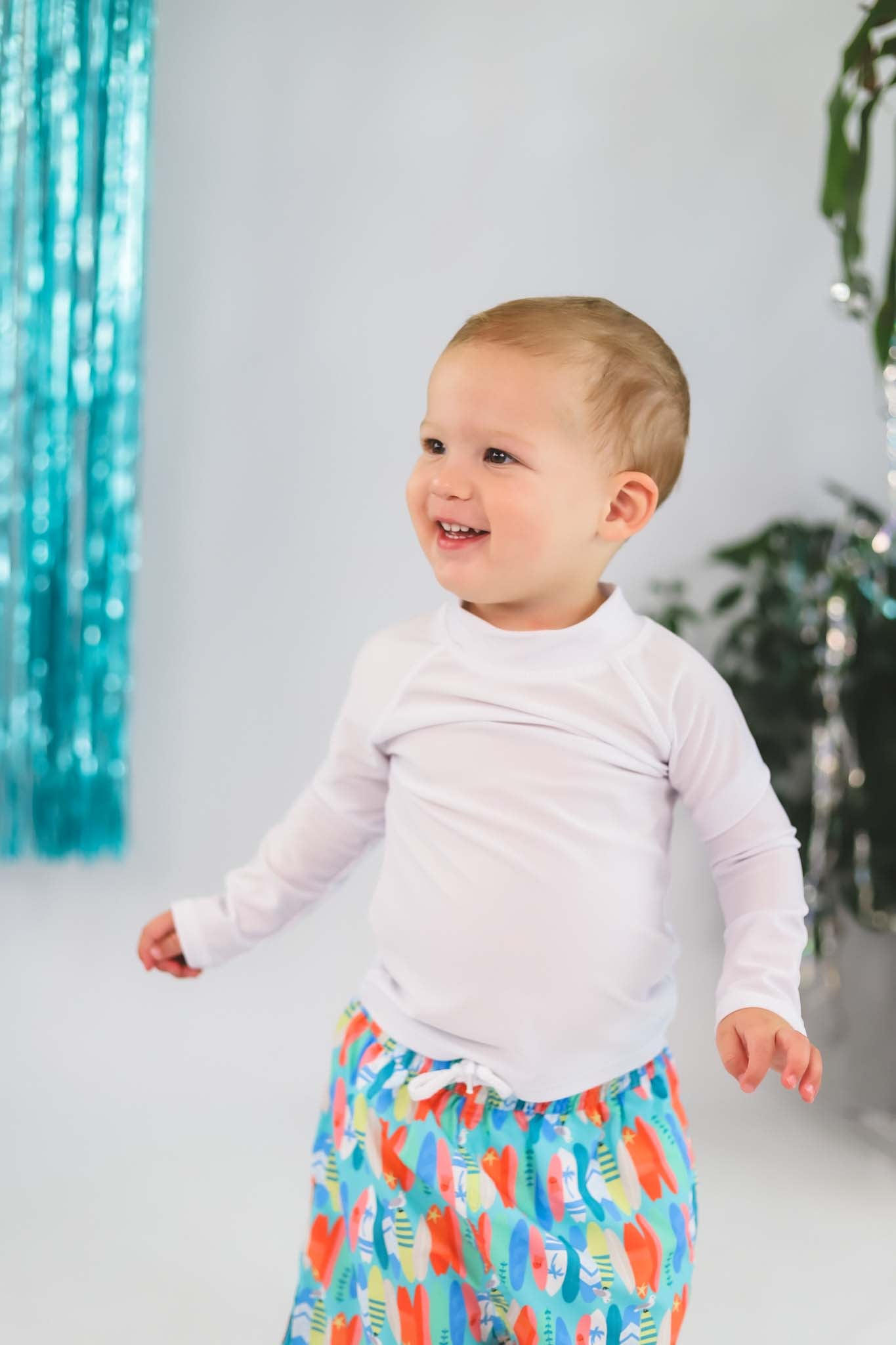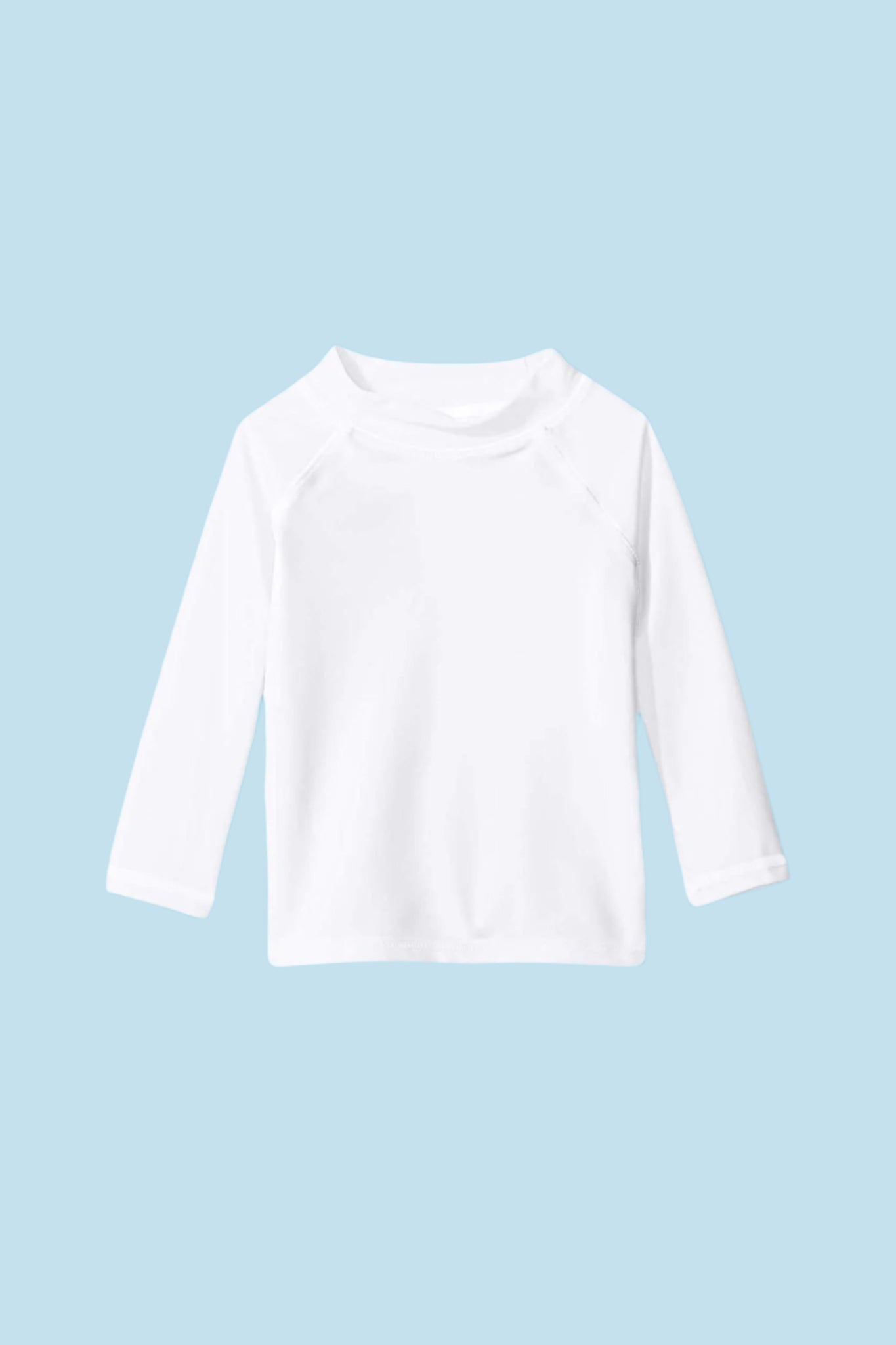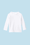This Flap Happy rash guard is perfect for long days spent poolside and oceanside! It features a mock neck and long sleeves. UPF 50+ helps to protect your little one from UV ray, while the bright white color makes it easy to match.