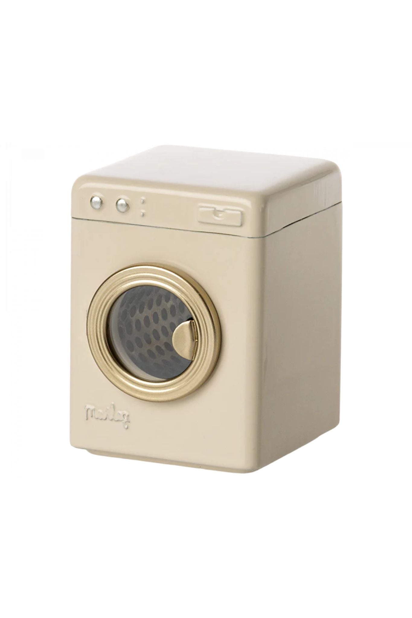 Teach your little one how to wash clothes with this adorable washing machine from Maileg. It comes in a neutral tone and features a gold door that can open and close.